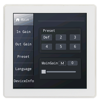 Настенный контроллер Audiocenter Wall control panel — сенсорная панель для управления аудиосистемами. IPS-экран 4" с разрешением 480x480, сенсорное управление. Подключение по протоколу RJ485. Питание 9-18 В, широкий диапазон рабочих температур от -20 до +70°C. Компактные габариты (90.7 х 90.7 х 27.9 мм), белый цвет. Обеспечивает удобный и современный интерфейс для контроля параметров процессоров и других устройств в системе.