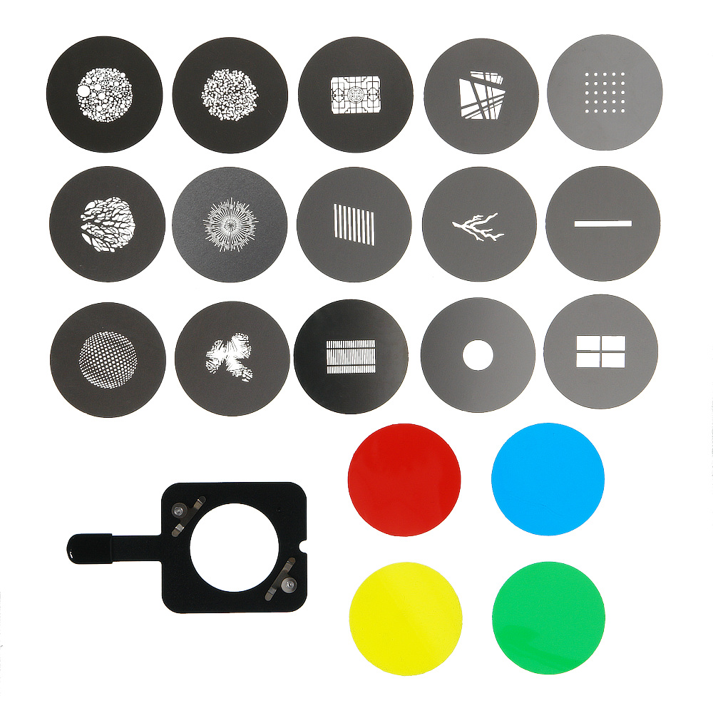 Маски Gobo – это модификаторы света, которые выполнены в виде металлического трафарета с перфорацией определённого рисунка. В комплект входят 15 масок Gobo с изображениями диагональных полос, вспышек, точек, кругов, веток и другие.