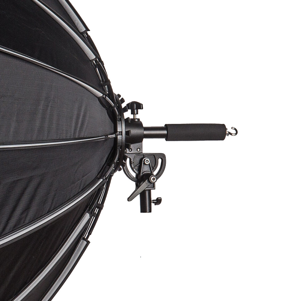 Зонт-отражатель Falcon Eyes PARAsoft 180 работает в паре со вспышками Falcon Eyes и других производителей, устанавливающимися на универсальный адаптер Bowens. Адаптер закрепляется на фокусировочной штанге, которая помогает настроить угол светового потока.