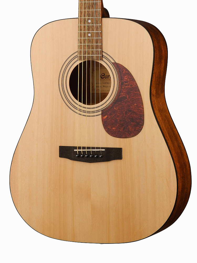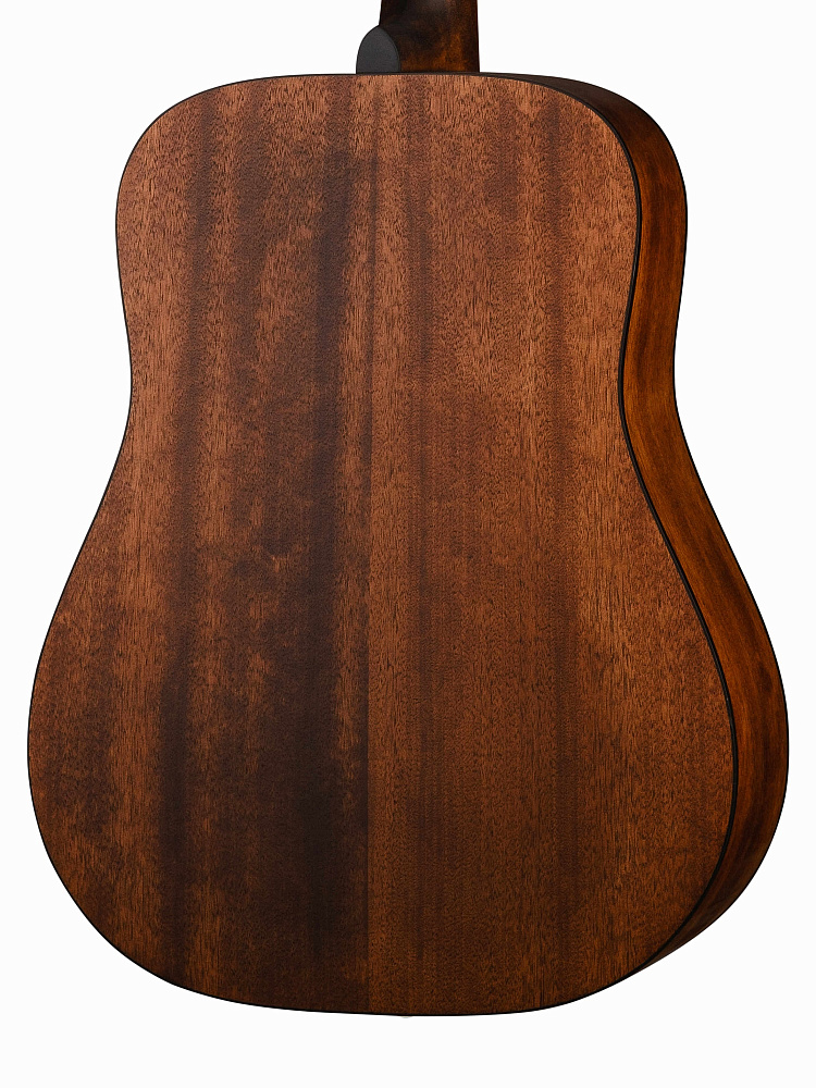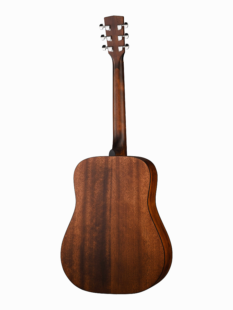 Акустическая гитара дредноут с чехлом, ремнем, тюнером, медиаторами. Верхняя дека: массив ели. Задняя дека и обечайка: красное дерево окоуме. Гриф: красное дерево. Накладка грифа: ованкол. Цвет: натуральный.