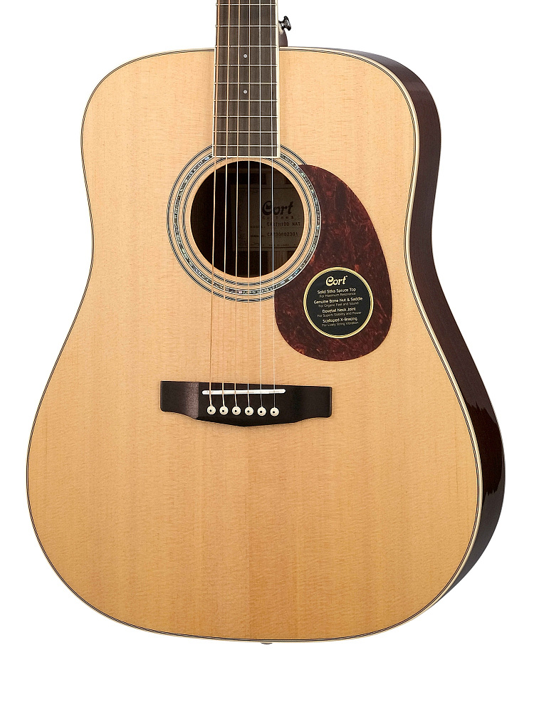 Акустическая гитара Cort EARTH100-NAT — акустическая гитара дредноут. Верхняя дека из массива ситхинской ели. Задняя дека и обечайка из красного дерева. Глянцевая отделка. Порожки из кости. Мощное, сбалансированное звучание.
