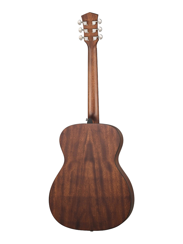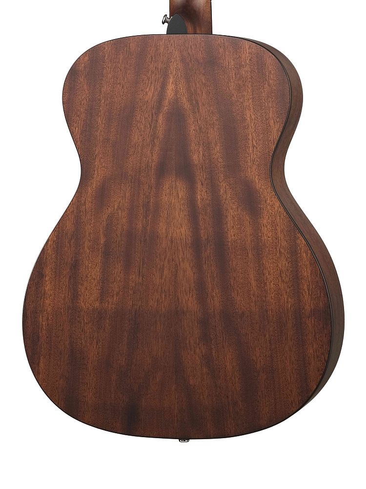Корпус гитары выполнен в форме Orchestra, что обеспечивает мощный и насыщенный звук. Верхняя дека изготовлена из махагони, что придает звучанию теплые и глубокие оттенки. Обечайка также выполнена из махагони, создавая единый гармоничный ансамбль с топом. Гриф из махагони обеспечивает надежность и долговечность, а накладка из палисандра добавляет изысканности и способствует комфортной игре.