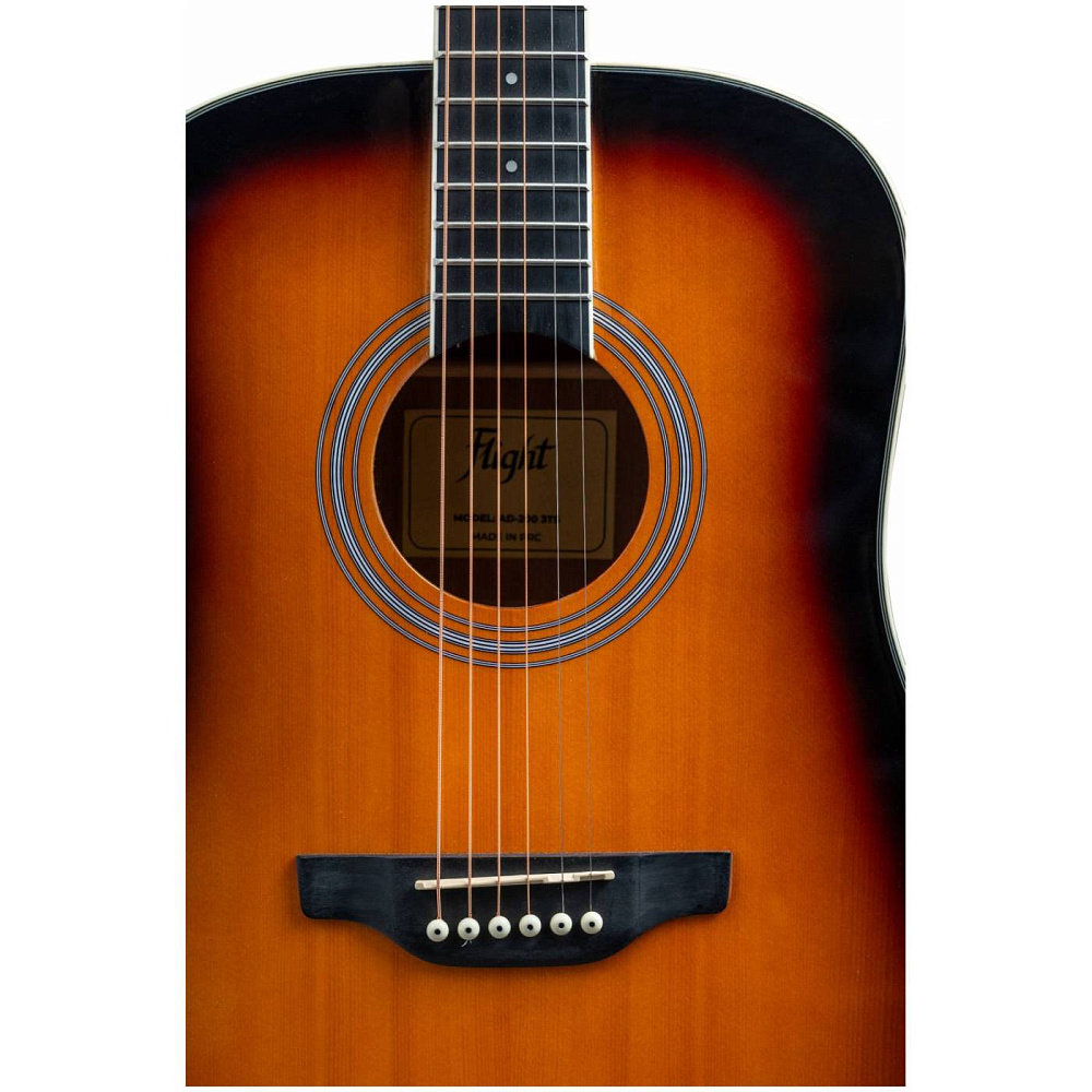 Акустическая гитара FLIGHT AD-200 3TS — доступный дредноут с отличным звуком. Верхняя дека из ели, корпус из красного дерева, гриф нато, цвет санберст. Удобный скос под правую руку (armrest). Надежный и неприхотливый инструмент для начинающих и любителей.