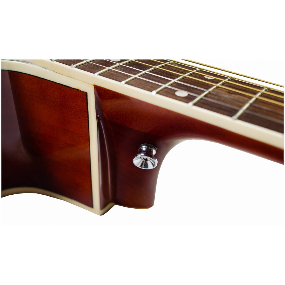 Двойное кольцо перламутрового цвета на розетке гармонично сочетается с перламутровой окантовкой на верхней деке. Инструмент выполнен в цвете санберст SunBurst и глянцевой отделке.