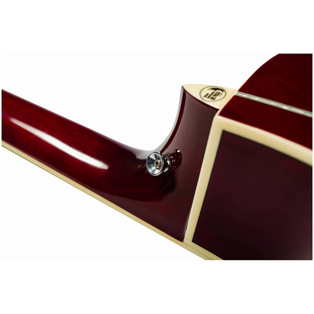 Двойное кольцо перламутрового цвета на розетке гармонично сочетается с перламутровой окантовкой на верхней деке. Инструмент выполнен в цвете насыщенного красного вина и глянцевой отделке.
