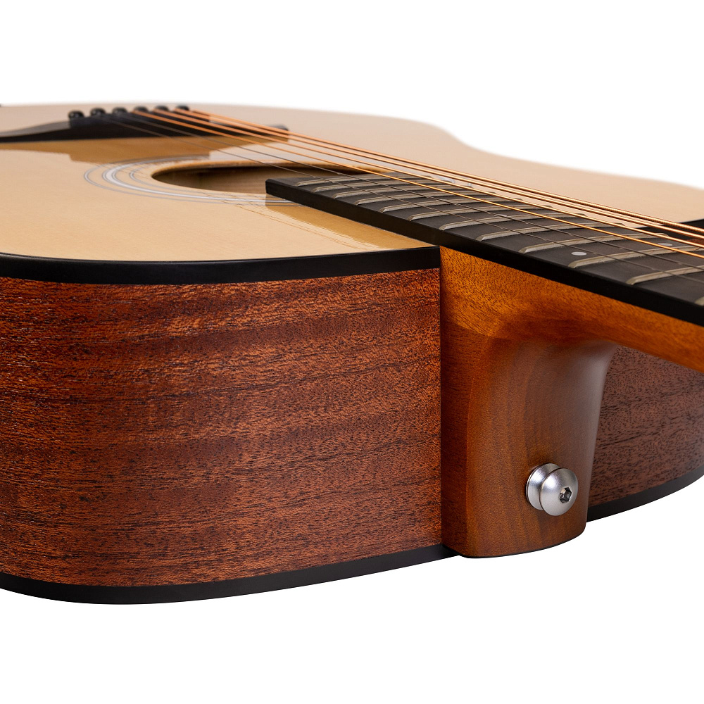 - Покрытие Open Pore обечайки и нижней деки: тонкая лаковая пропитка оставляет поры дерева открытыми, позволяя древесине дышать, за счет чего звучание гитары становится особенно ярким и звонким.