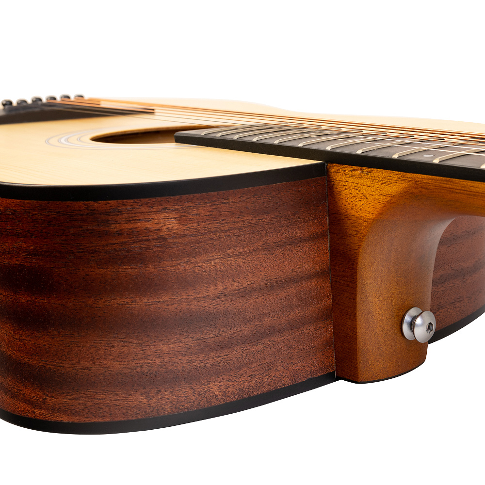 - Покрытие Open Pore обечайки и нижней деки: тонкая лаковая пропитка оставляет поры дерева открытыми, позволяя древесине дышать, за счет чего звучание гитары становится особенно ярким и звонким.