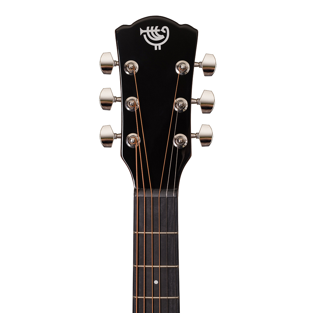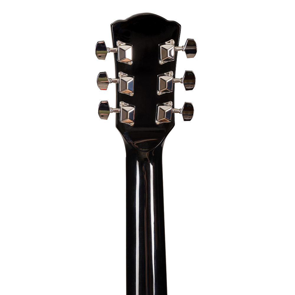 - Форма корпуса Dreadnought: дредноут это классика среди форм корпуса акустических гитар. Он отличается сбалансированным звуком с ярко выраженными верхними частотами и упругими низкими.