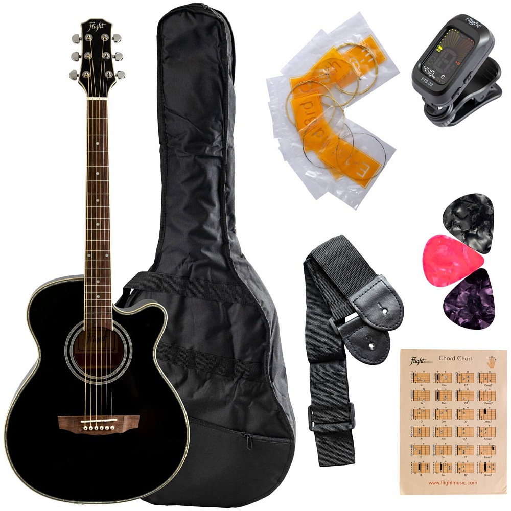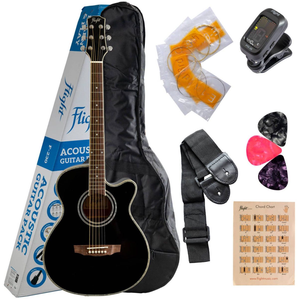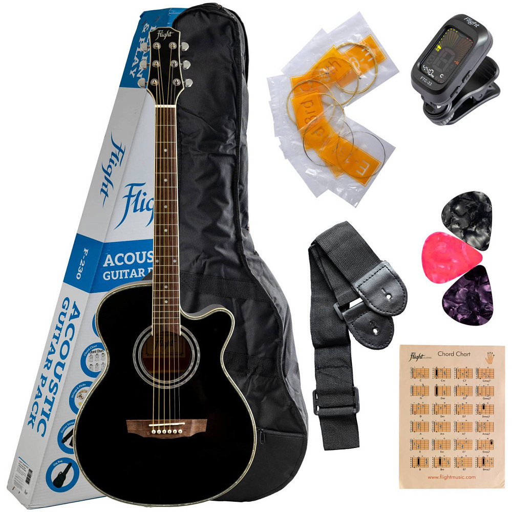 Акустическая гитара в наборе FLIGHT F-230 BLK PACK — готовый набор: фолк-гитара черного цвета, чехол, ремень, тюнер, струны, медиаторы. Компактный корпус с вырезом, металлические струны. Полный комплект аксессуаров для начала игры.