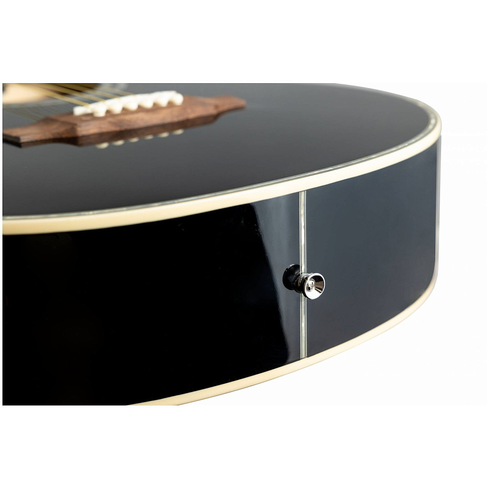 Двойное кольцо перламутрового цвета на розетке гармонично сочетается с перламутровой окантовкой на верхней деке. Инструмент выполнен в чёрном цвете и глянцевой отделке.