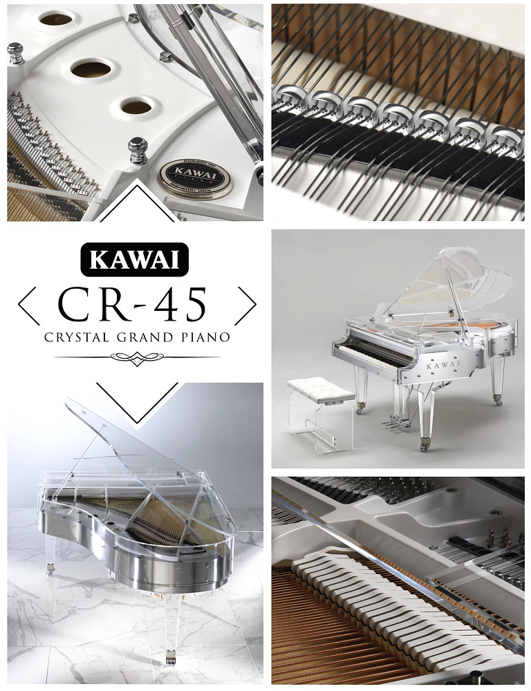 Акустический "Хрустальный" рояль Kawai CR‑45 — эксклюзивный рояль-арт-объект с полностью прозрачным корпусом из высокопрочного акрила. Ограниченная серия (всего 3 инструмента в год) для роскошных интерьеров, отелей и ресторанов . Оснащен механизмом Millennium III, клавишами Neotex, двойными роликами и регулятором пюпитра. Уникальный дизайн позволяет видеть работу механизма, создавая незабываемое зрелище и усиливая акустическое впечатление.