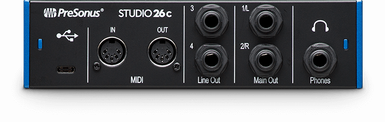 АЦП/ЦАП интерфейса имеют динамический диапазон 114 дБ и поддерживают режимы частоты дискретизации до 192 кГц. Studio 26c предлагает 2 комбинированных входа c предусилителями XMAX-L, 4 линейных TRS выхода, MIDI IN/OUT, выход для наушников. На передней панели устройства находятся регуляторы усиления, светодиодные индикаторы уровней, кнопка A/B для переключения звука между несколькими источниками в наушниках, а также кнопки Mon, Line, 48V.
