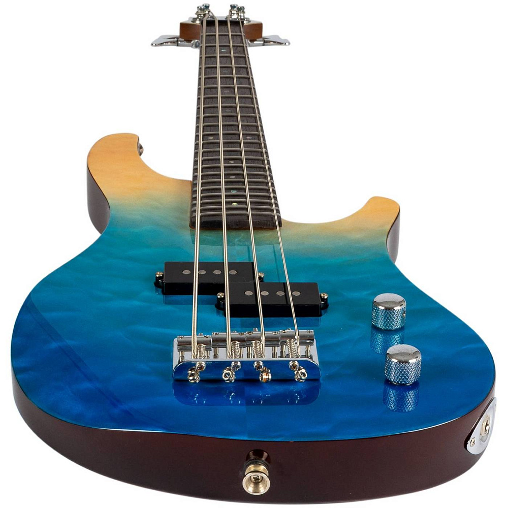 Верхняя дека Mini Bass TBL выполнена из волнистого клёна и украшена потрясающим синим градиентом, в результате получился великолепный инструмент, напоминающий нам о море и песке.