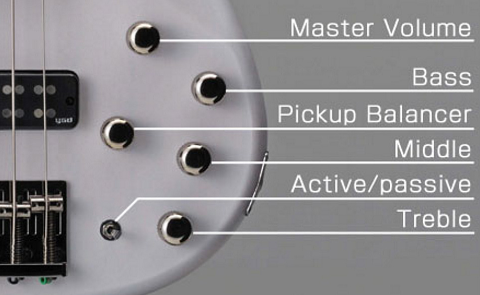 | Регуляторы | Громкость, баланс звукоснимателей, НЧ, СЧ, ВЧ, переключатель активного/пассивного режимов (индикатор разрядки батареи на задней части корпуса) |