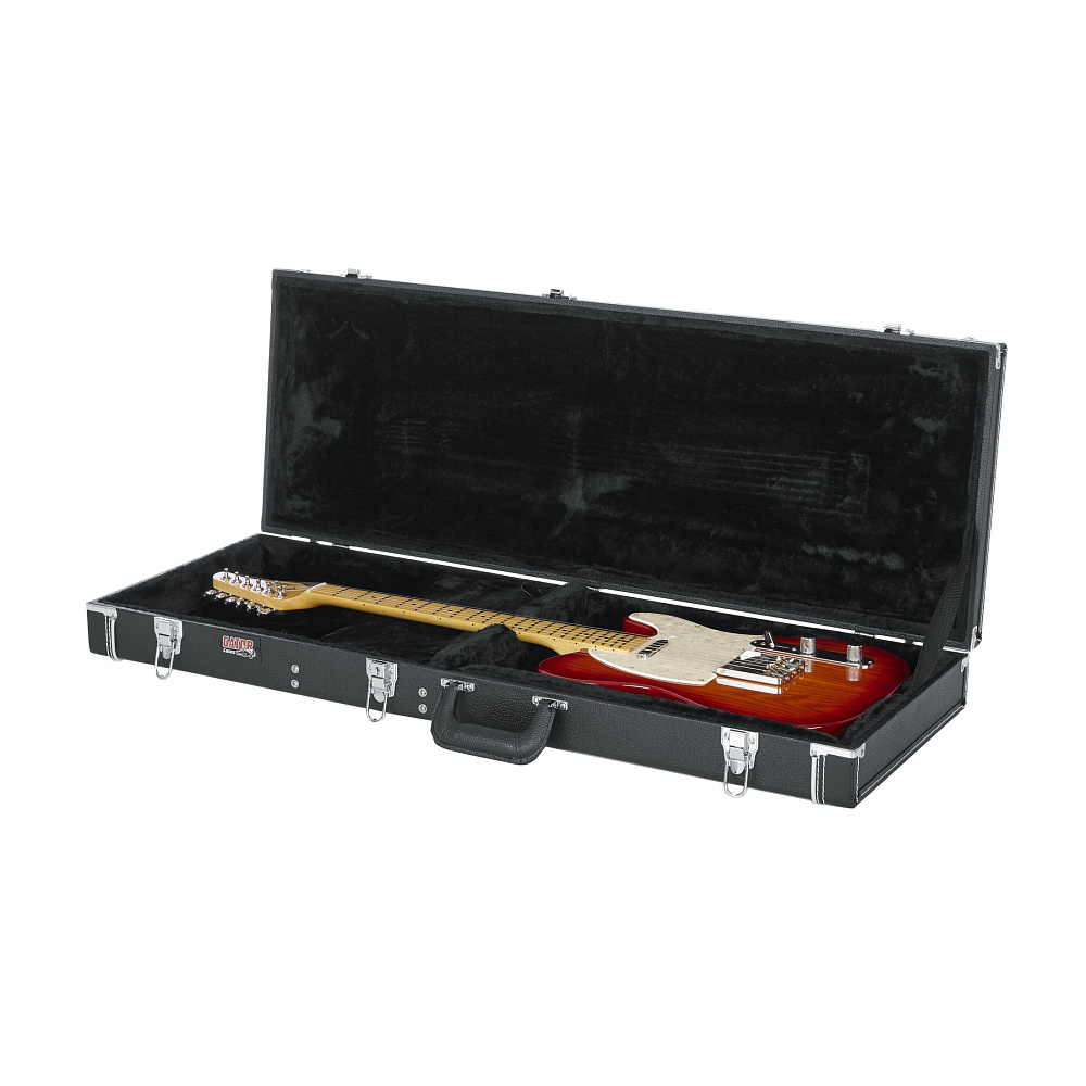 Кейс для электрогитары GATOR GW-ELECTRIC — деревянный кейс класса «делюкс» для электрогитар. Изготовлен из листовой фанеры, внутренняя плюшевая отделка, антиударный пенопластовый слой, тройная хромировка фурнитуры.