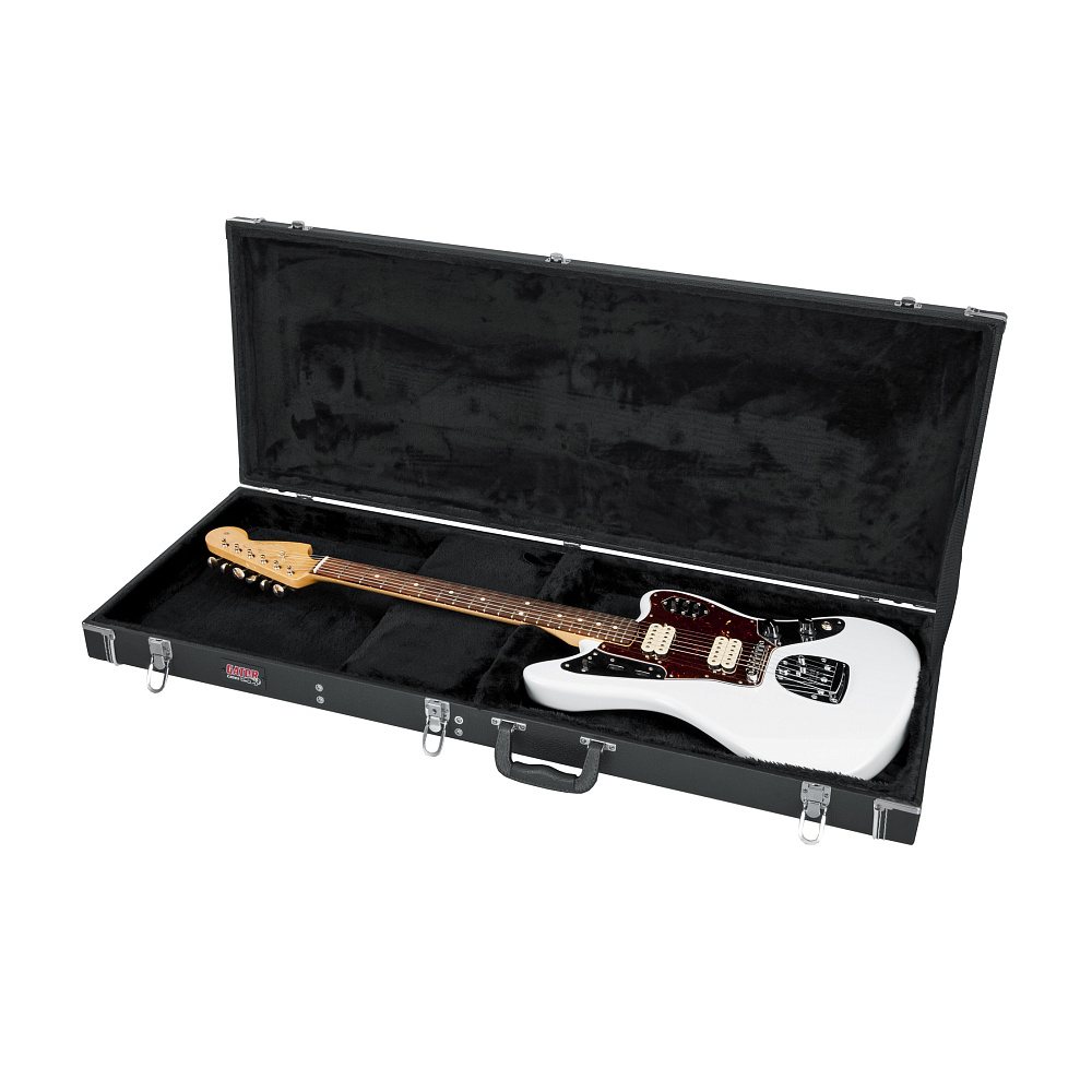 Кейс для электрогитары GATOR GW-JAG — деревянный кейс класса 'делюкс' для электрогитар Fender Jaguar, Jazzmaster и подобных. Изготовлен из фанеры, внутренняя плюшевая отделка, антиударный слой, хромированная фурнитура. Идеальная посадка.