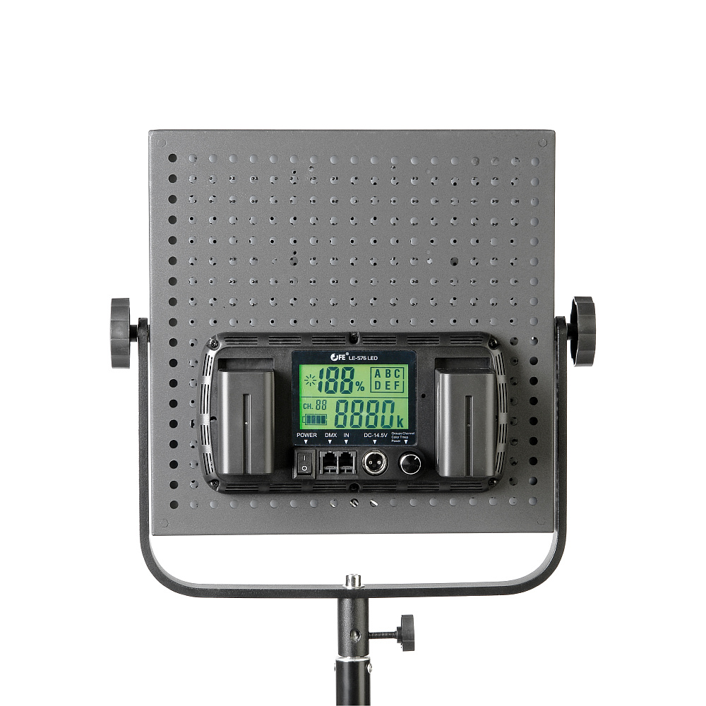 Falcon Eyes LE-900 LED - доступное решение для освещения съемочной сцены, обладающее полным функционалом старших моделей – регулировка цветовой температуры, DMX-управление, большой ЖК-дисплей, 4-лепестковые шторки, возможность питания от аккумуляторов серии NP-F, а также комплектуется пультом дистанционного управления.