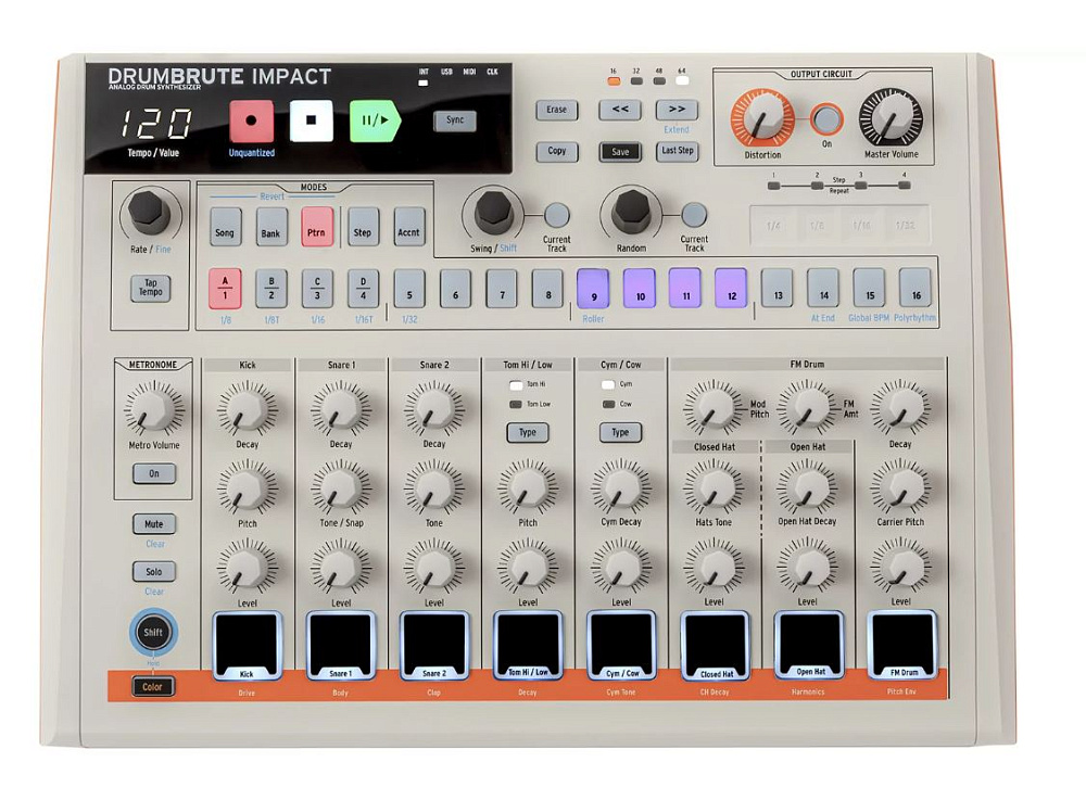 Драм-машина Arturia DrumBrute Impact 1984 — аналоговая драм-машина в ретро-стилистике 1984 года. 10 аналоговых тембров ударных, 64-шаговый секвенсор. Функции Roller, Step Repeat, Looper и встроенный дисторшн. Тёплое и агрессивное звучание для электронной музыки.