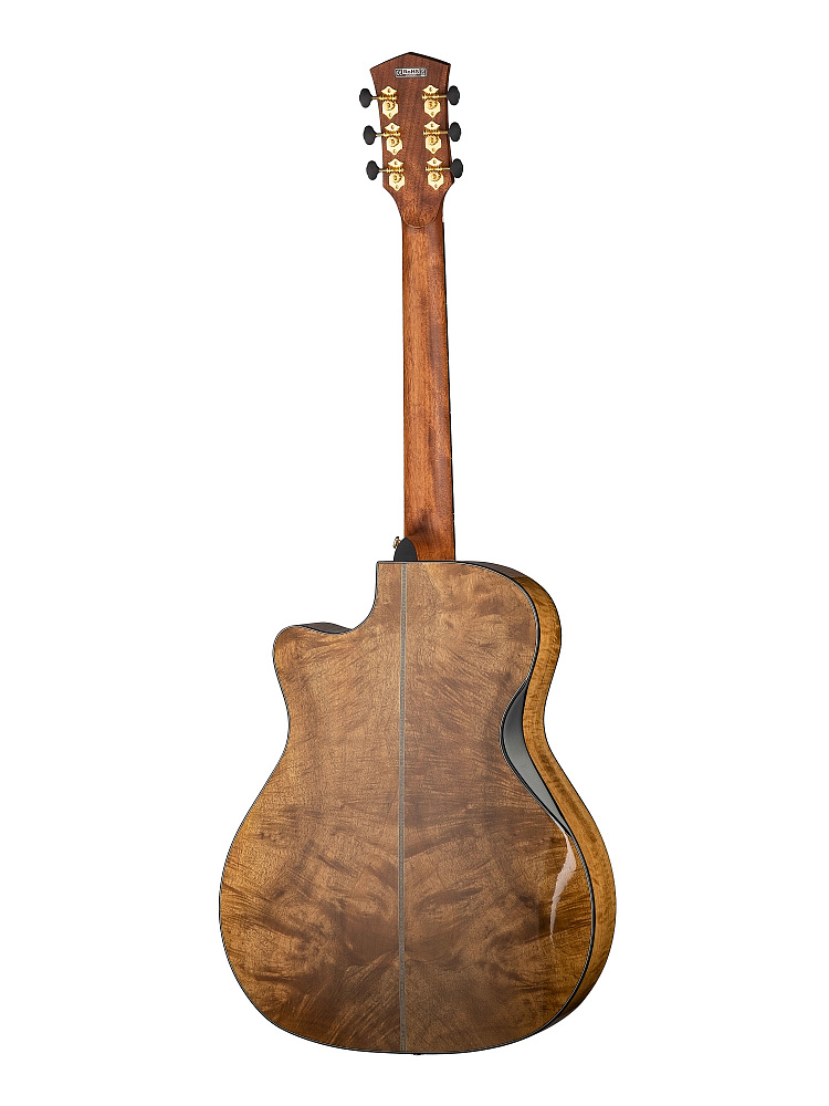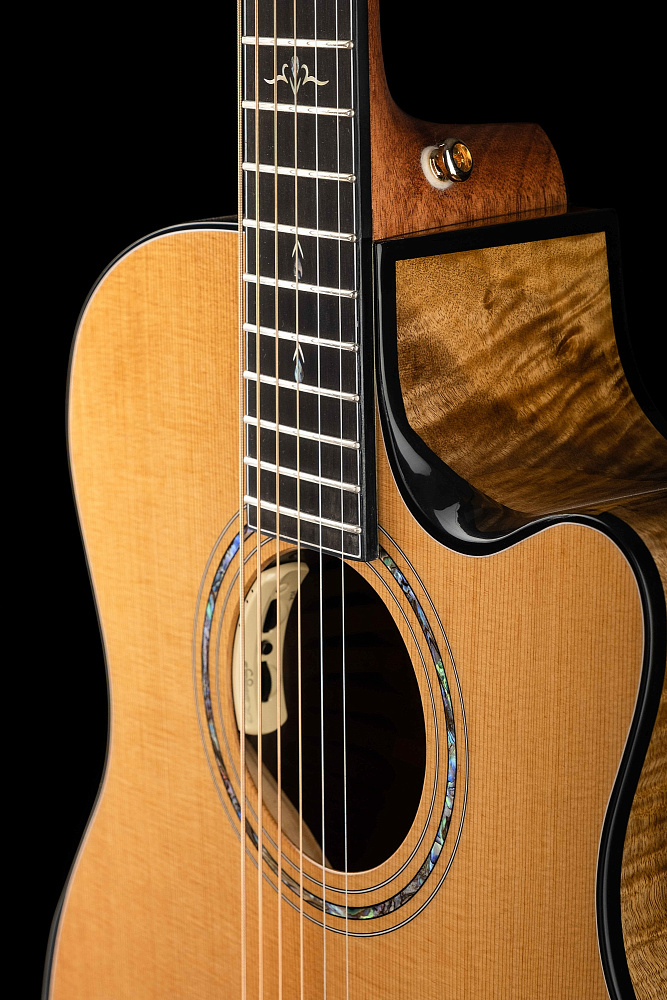 Задняя дека и обечайка изготовлены из массива лавра (Myrtlewood) с ярким, но мягким и теплым звучанием. Чистое и мощное, оно подчеркивает высокие средние частоты для превосходной артикуляции. Рисунок древесины зависит от сорта, и для модели Gold-Edge использован лучший из возможного.