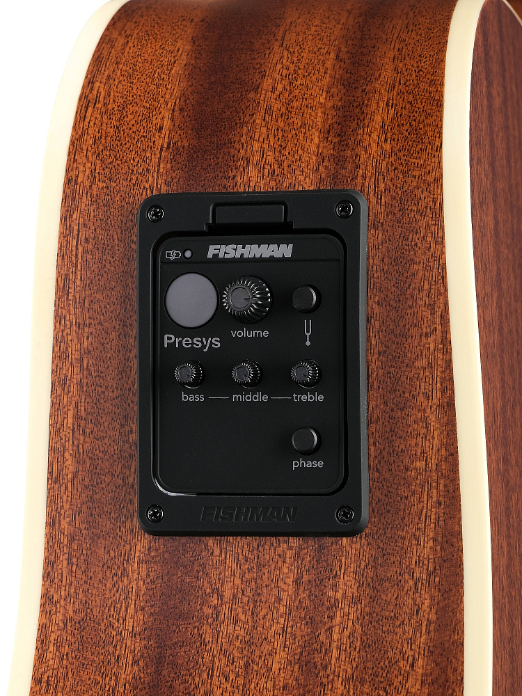 Электроакустическая гитара, леворукая, с вырезом, цвет натуральный, матовый. Верхняя дека из массива ситхинской ели. Задняя дека и обечайка из красного дерева. Электроника Fishman Presys EQ. Чехол в комплекте.
