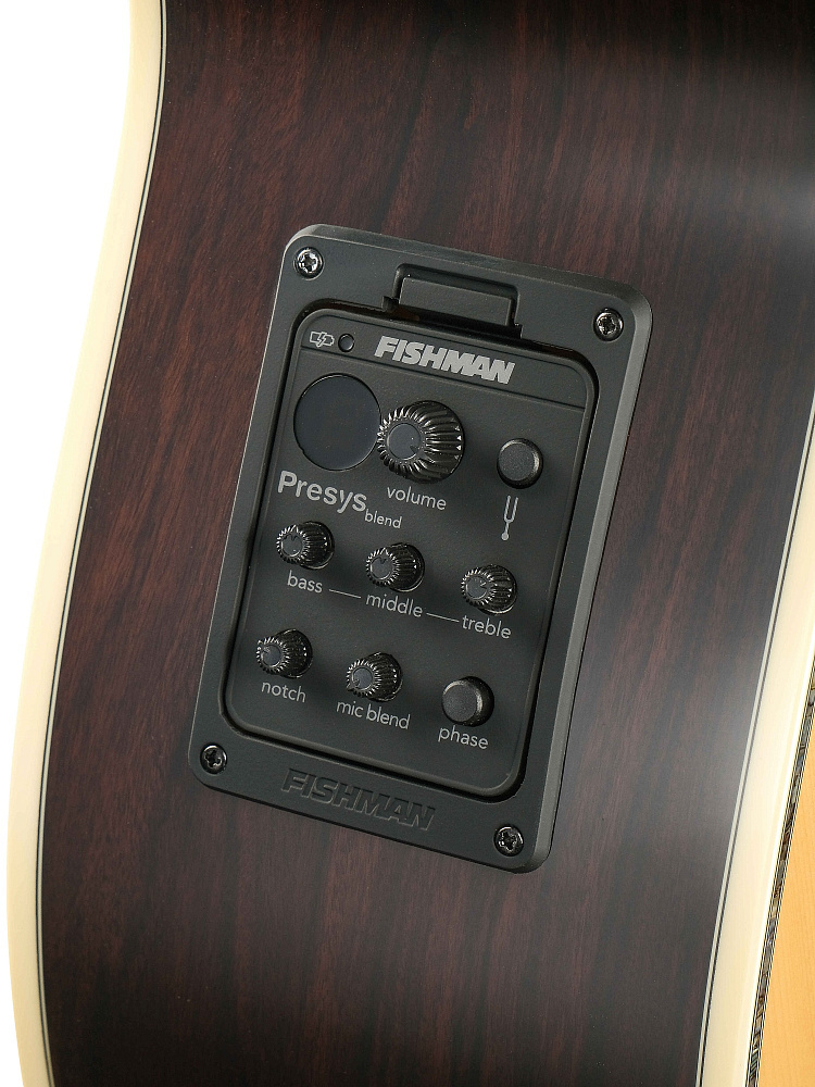 Корпус уникальной формы и размером 100х125мм обеспечивает объемное звучание, электроника Fishman - мощное усиление, а резкий флорентийский вырез — современный внешний вид и удобный доступ к верхним ладам.