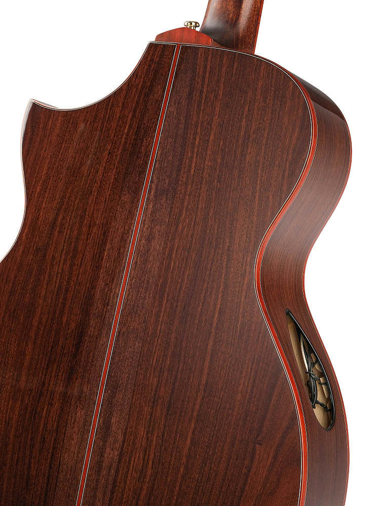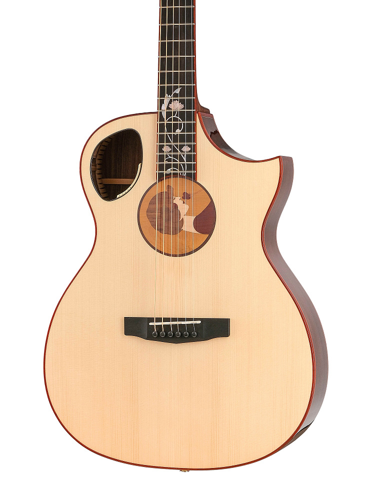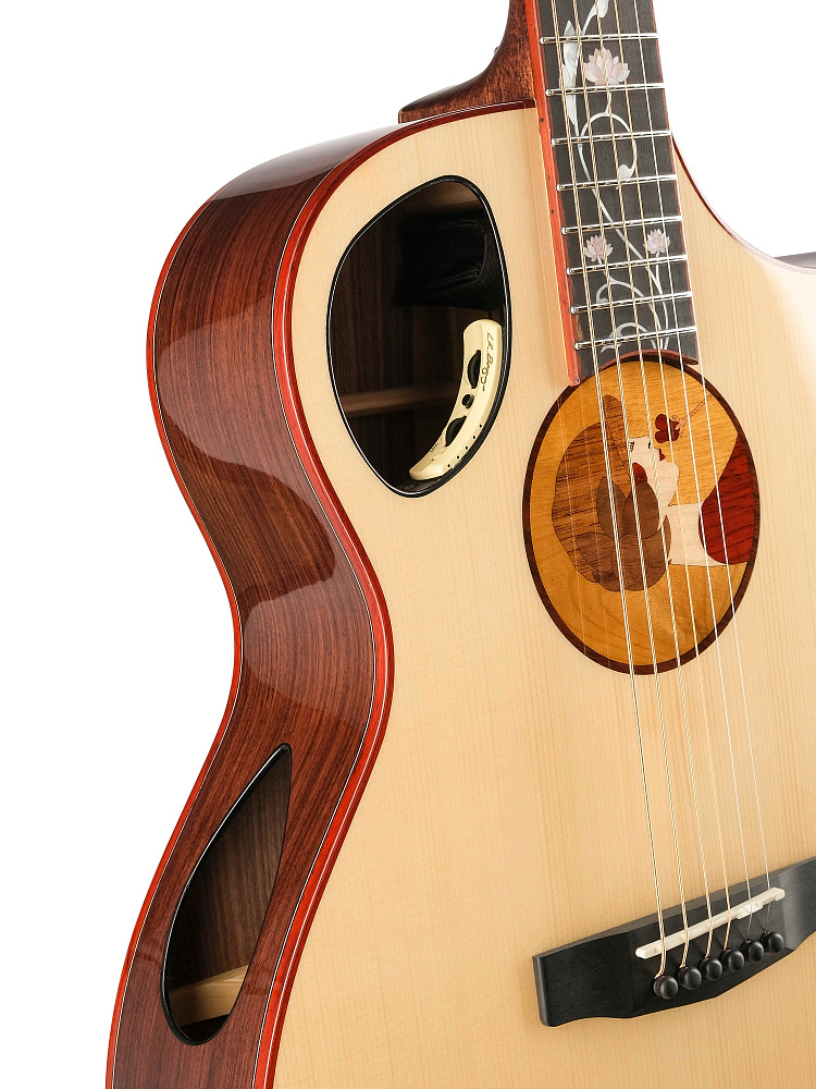 Вместо обычного резонаторного отверстия в центре корпуса вырезано смещенное звуковое отверстие в форме семени, которое соответствует контуру корпуса. Сбоку имеется второе резонаторное отверстие, которое влияет на резонанс Гельмгольца корпуса и усиливет динамику и высокие частоты акустического тембра. Это также позволяет игроку лучше контролировать естественное звучание гитары во время выступления