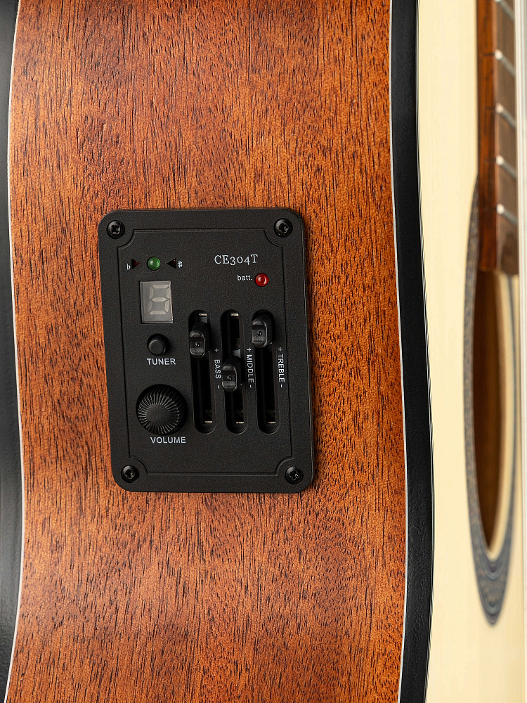Гитара оснащена керамическим пьезозвукоснимателем с предусилителем Cort CE304T, передающими теплое и чистое звучание.