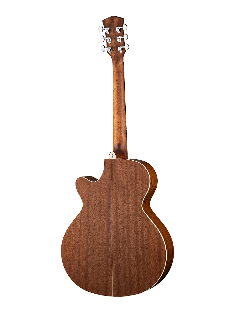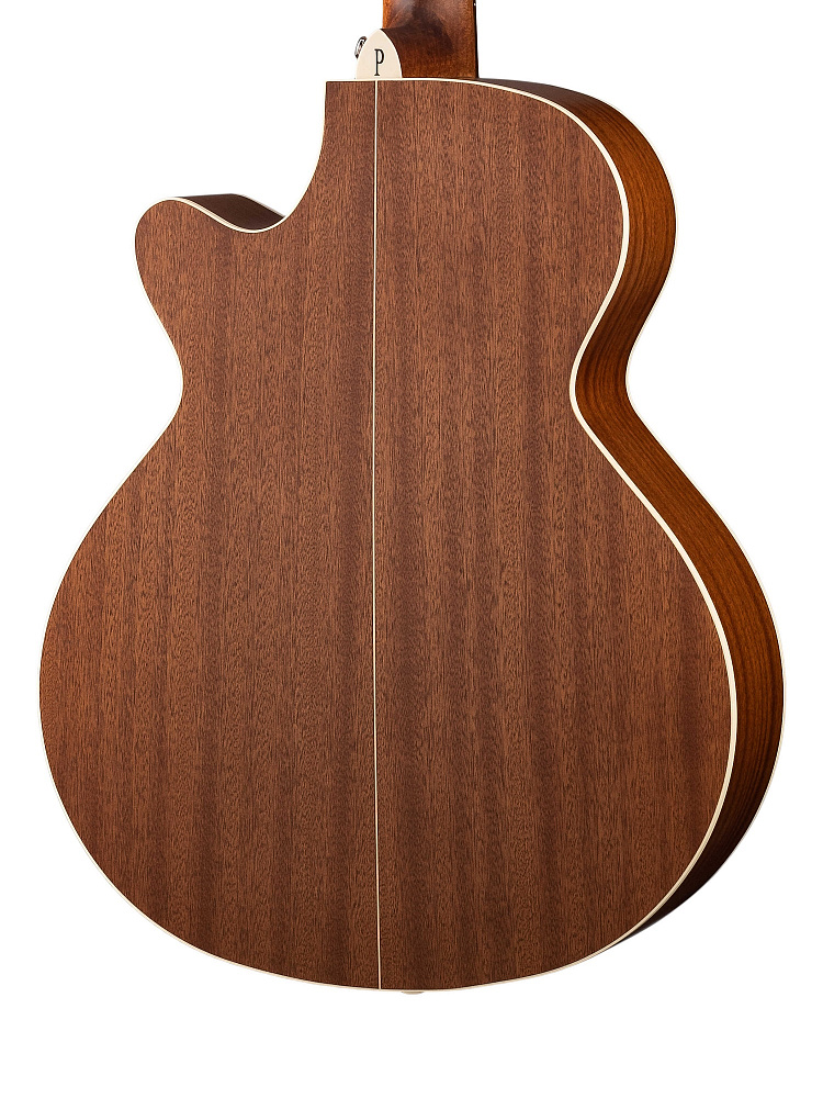 Верхняя дека изготовлена из массива ситхинской ели, задняя дека и обечайки — из шпона махагони.