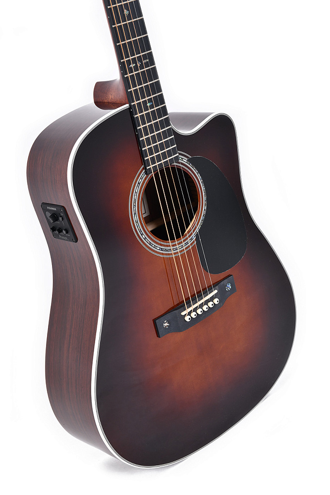 Электроакустическая гитаra Sigma DTC-1E-SB — электроакустическая гитара дредноут с вырезом. Верх из массива ситхинской ели, корпус из тилии. Звукосниматель Fishman ISYS+ с тюнером. Накладка из микарты, ширина грифа 42.9 мм. Цвет Sunburst (санберст). Популярная модель для сцены и студии.