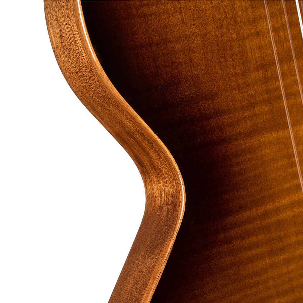 Верхняя дека из массива ели с отделкой из волнистого клёна на корпусе из красного дерева с полостями.