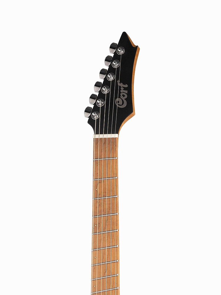 Электрогитара Cort X700-Mutility-BKS — чёрная мультимензурная гитара (24.75" – 25.5"). Корпус из красного дерева с топом из клена и ясеня. Звукосниматели Fishman Fluence Modern, бридж с индивидуальными седлами, гриф из обожжённого клена, веерные лады из нержавеющей стали, метки Luminlay.