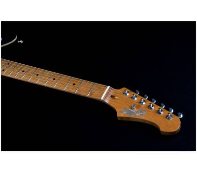 Гриф и накладка на гриф выполнены из печеного клена (roasted maple). При такой обработке поры дерева максимально сжимаются и в процессе использования вода уже не будет выходить, ваша накладка не сожмется и лады не повылазят вне зависимости от влажности и смены температуры. Плюс такое дерево выглядит очень красиво.