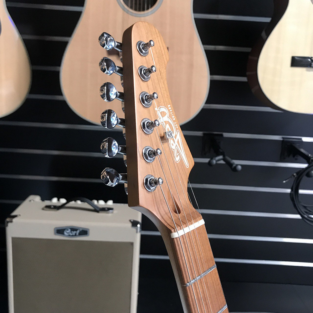 Гриф и накладка на гриф выполнены из печеного клена (roasted maple). При такой обработке поры дерева максимально сжимаются и в процессе использования вода уже не будет выходить, ваша накладка не сожмется и лады не повылазят вне зависимости от влажности и смены температуры. Плюс такое дерево выглядит очень красиво.