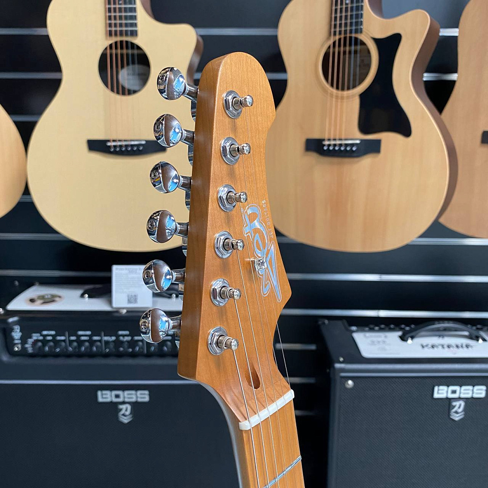 Гриф и накладка на гриф выполнены из печеного клена (roasted maple). При такой обработке поры дерева максимально сжимаются и в процессе использования вода уже не будет выходить, ваша накладка не сожмется и лады не повылазят вне зависимости от влажности и смены температуры. Плюс такое дерево выглядит очень красиво.