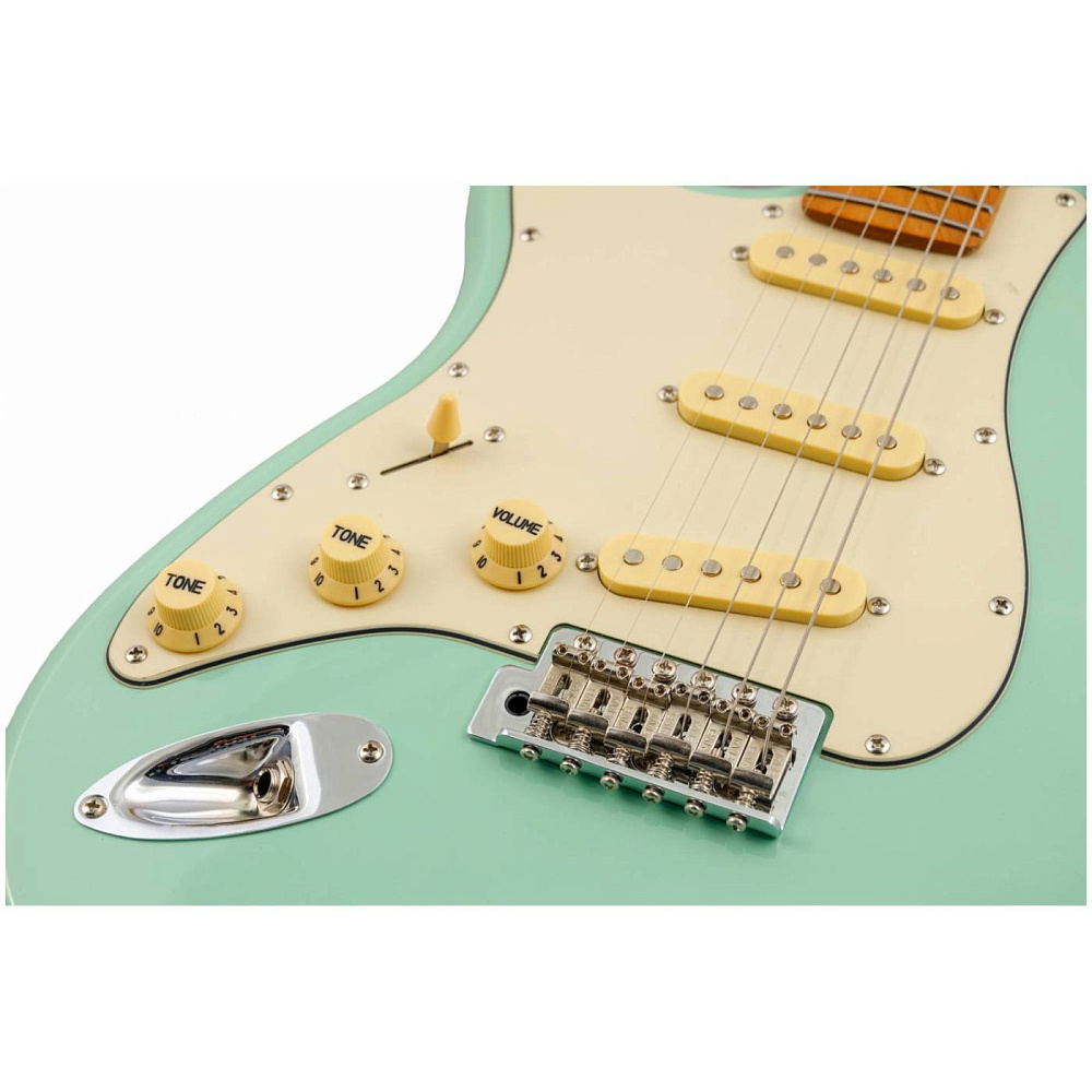 Электрогитара JET JS-300 SFG LH — электрогитара типа Stratocaster для левшей цвета морской волны. Корпус из запеченного тополя, гриф и накладка из запеченного клена. Конфигурация SSS. Специально создана для музыкантов-левшей.