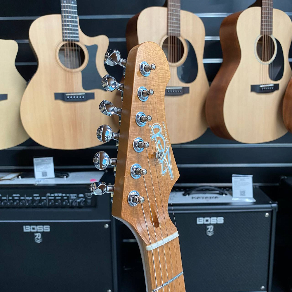 Гриф и накладка на гриф выполнены из печеного клена (roasted maple). При такой обработке поры дерева максимально сжимаются и в процессе использования вода уже не будет выходить, ваша накладка не сожмется и лады не повылазят вне зависимости от влажности и смены температуры. Плюс такое дерево выглядит очень красиво.