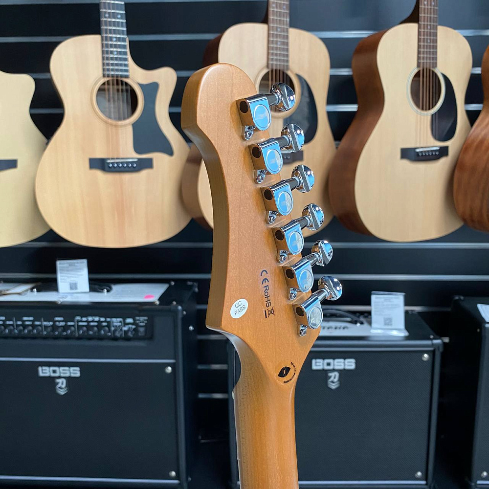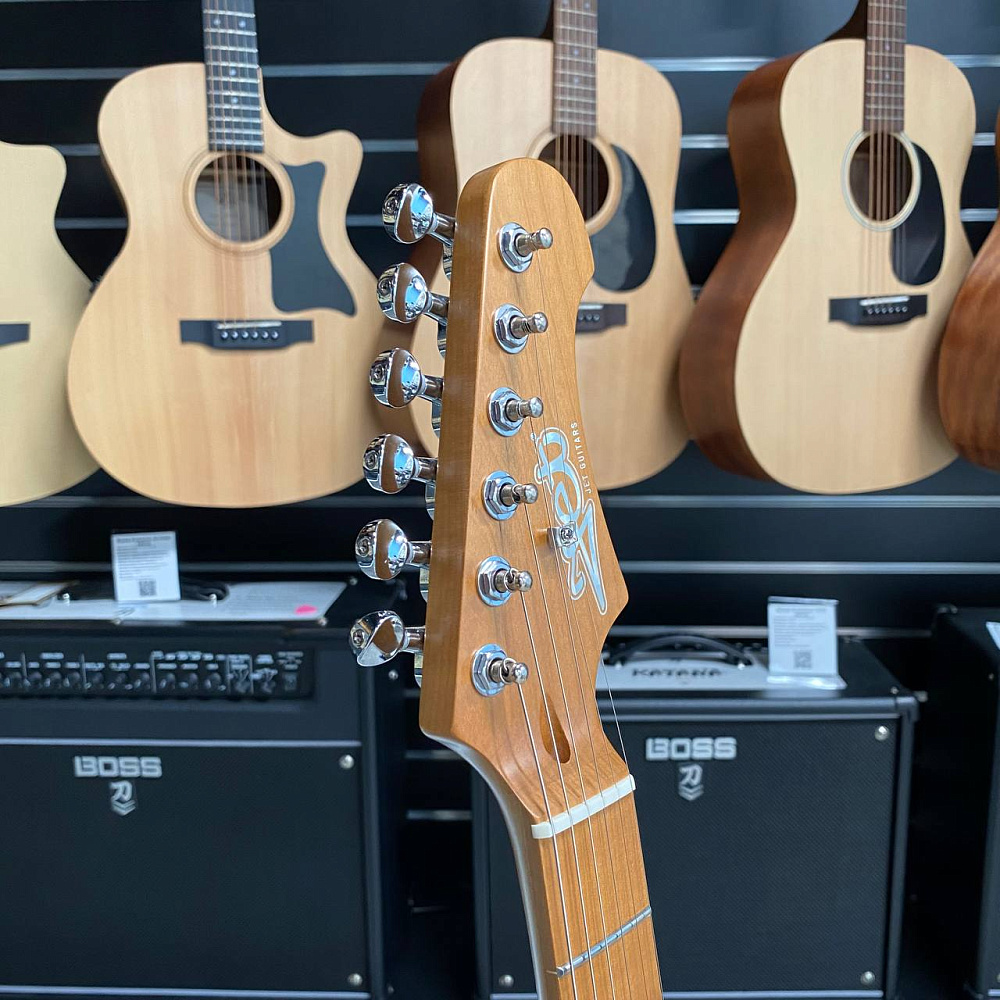 Гриф и накладка на гриф выполнены из печеного клена (roasted maple). При такой обработке поры дерева максимально сжимаются и в процессе использования вода уже не будет выходить, ваша накладка не сожмется и лады не повылазят вне зависимости от влажности и смены температуры. Плюс такое дерево выглядит очень красиво.