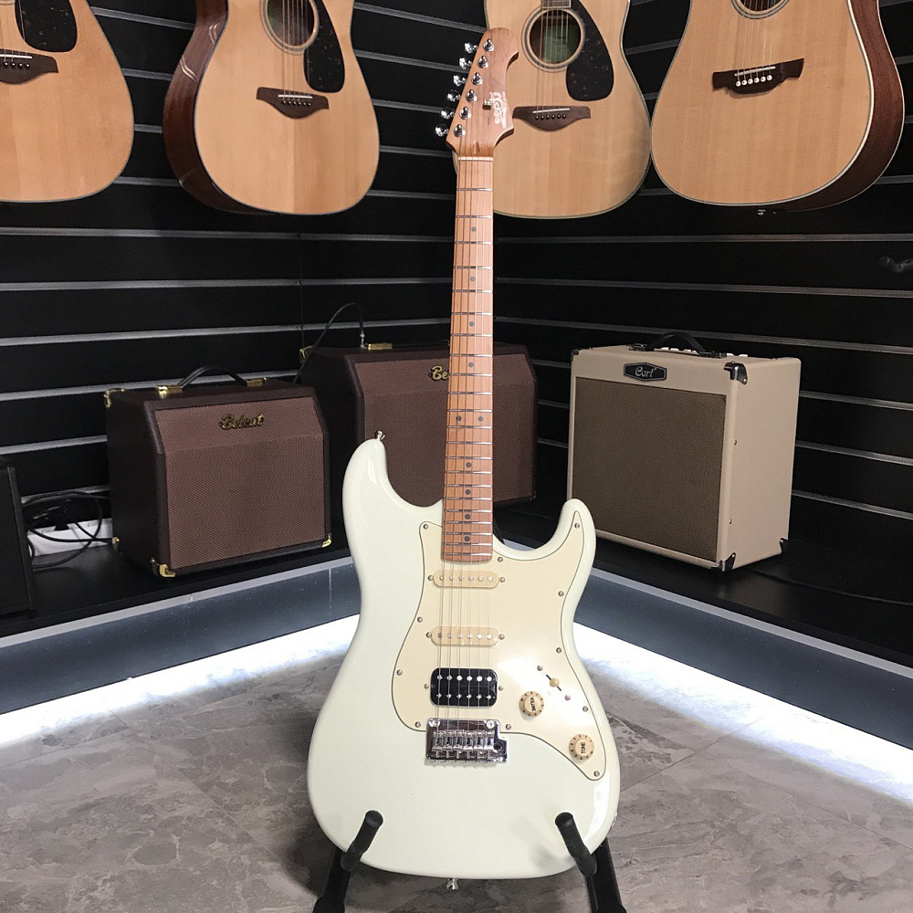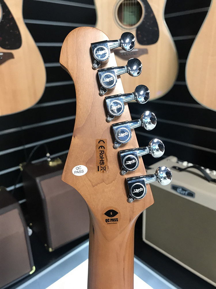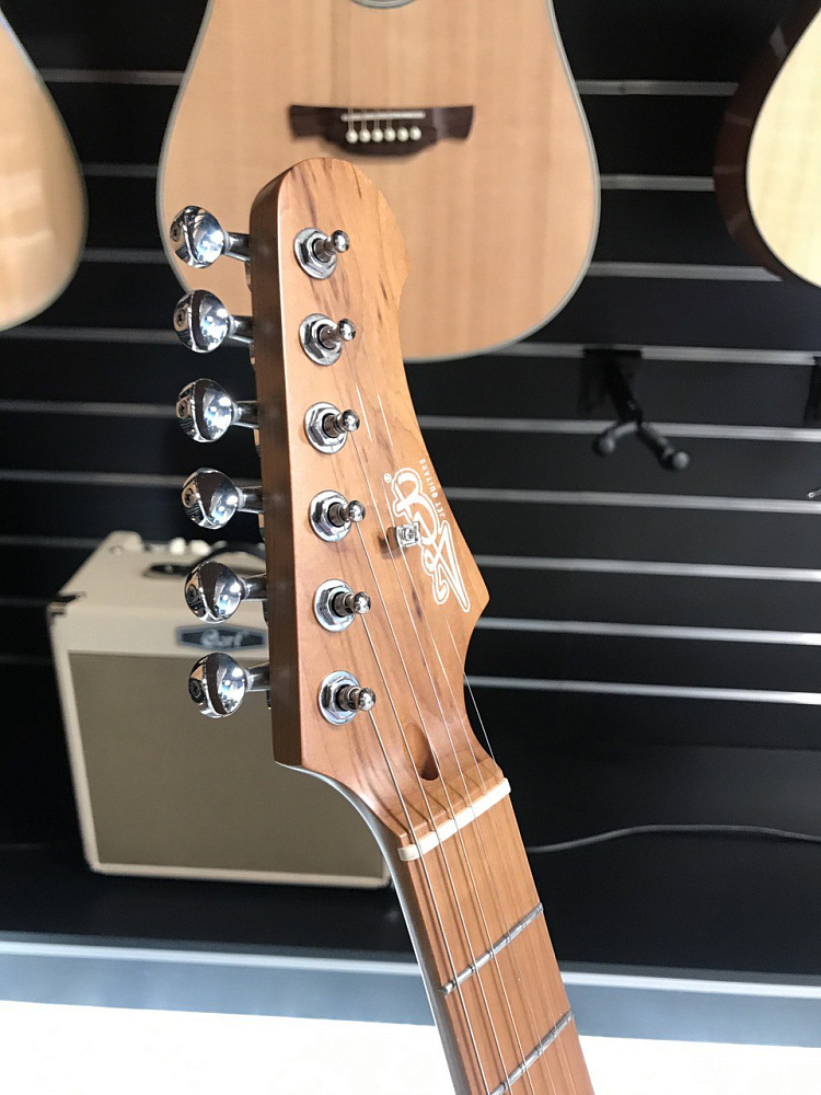Гриф и накладка на гриф выполнены из печеного клена (roasted maple). При такой обработке поры дерева максимально сжимаются и в процессе использования вода уже не будет выходить, ваша накладка не сожмется и лады не повылазят вне зависимости от влажности и смены температуры. Плюс такое дерево выглядит очень красиво.