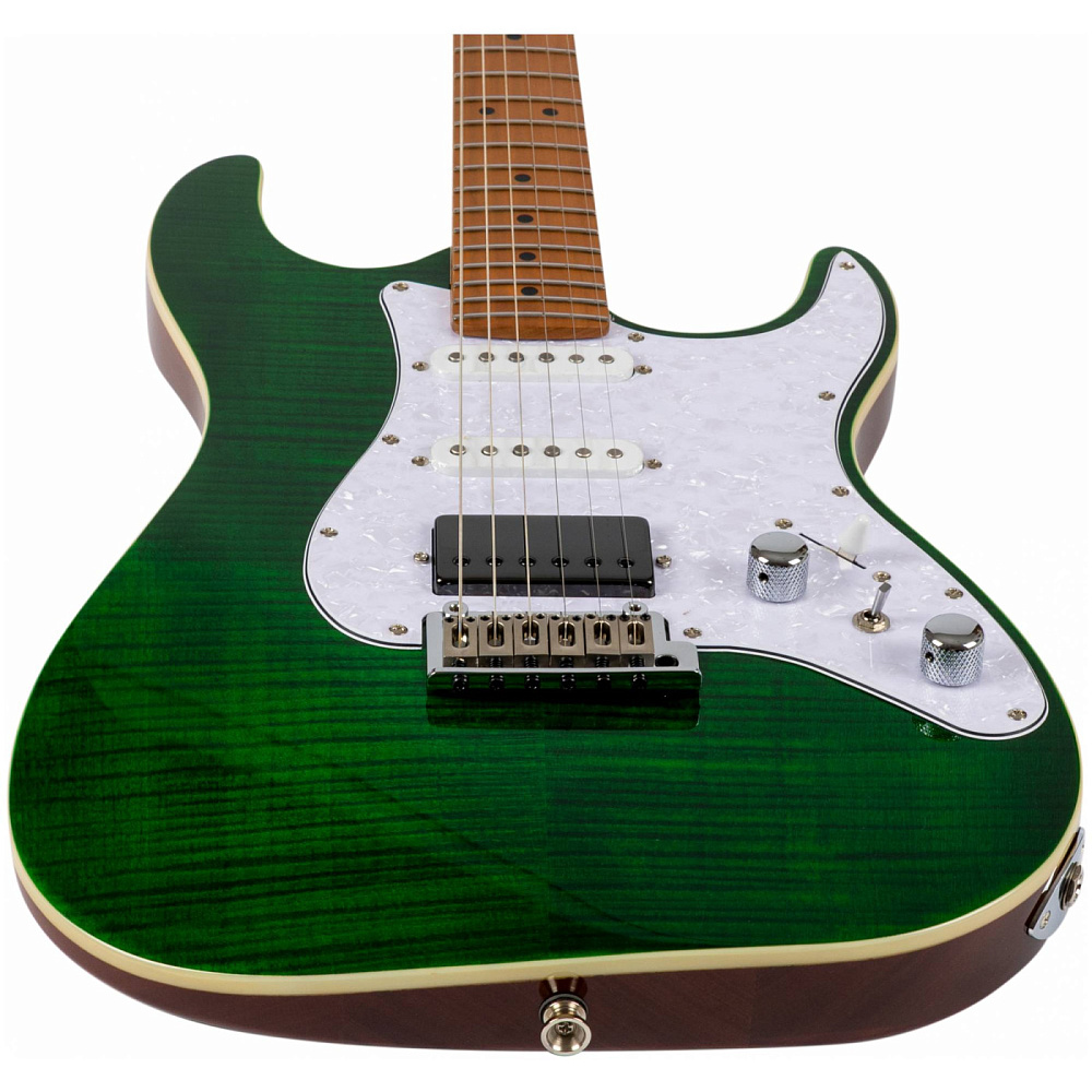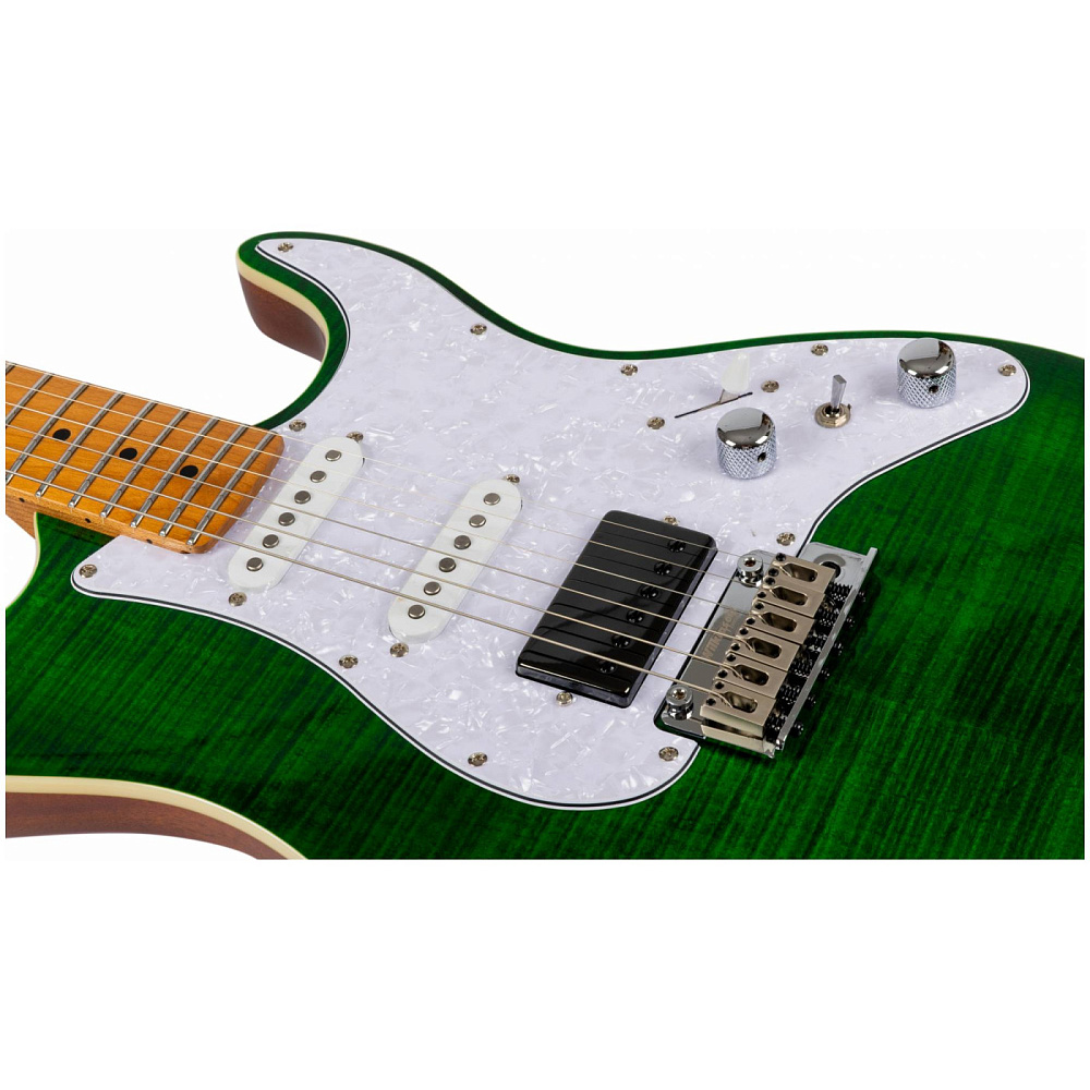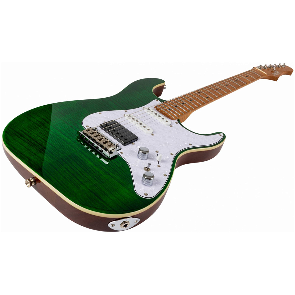 Электрогитара JET JS-600 TGR — электрогитара типа Superstrat с топом из тигрового клена. Корпус из красного дерева для теплого звучания, гриф Modern C. Верхняя дека из огненного клена с красивым рисунком. Сбалансированное звучание.