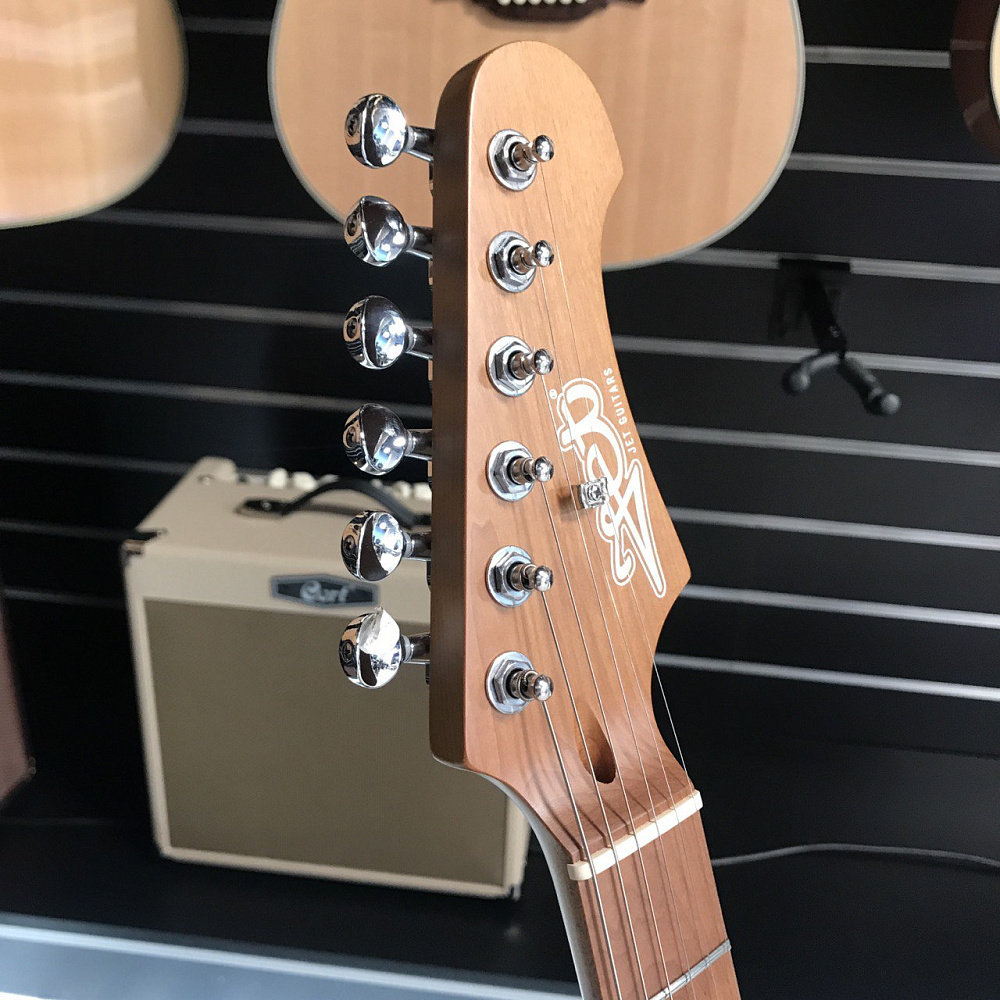 Гриф и накладка на гриф выполнены из печеного клена (roasted maple). При такой обработке поры дерева максимально сжимаются и в процессе использования вода уже не будет выходить, ваша накладка не сожмется и лады не повылазят вне зависимости от влажности и смены температуры. Плюс такое дерево выглядит очень красиво.