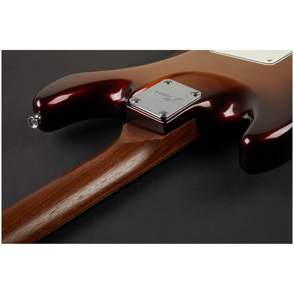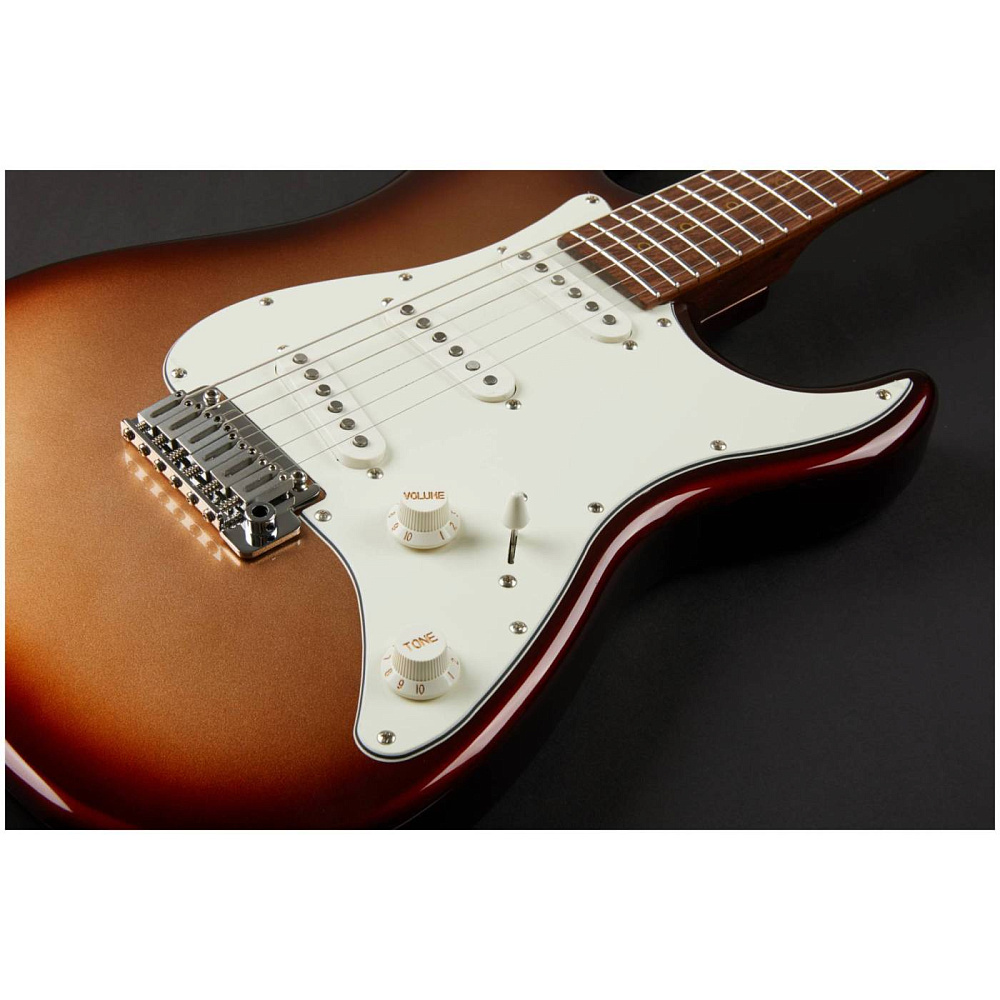 Электрогитара шестиструнная, стратокастер SSS. Корпус - ольха, гриф - орех с накладкой из пау ферро. Цвет санбёрст. Чехол в комплекте.