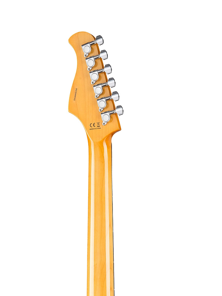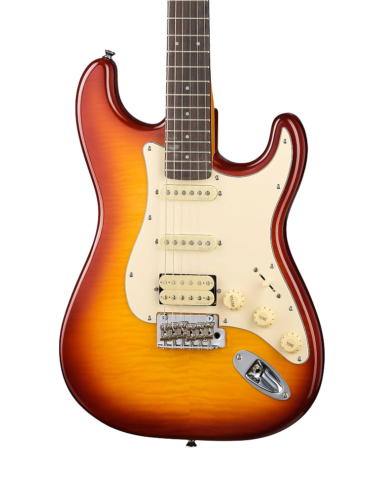 Конфигурация звукоснимателей: хамбакер и два сингла, при этом хамбакер обеспечивает более высокий выходной уровень, идеально подходящий для сильного насыщения без помех.