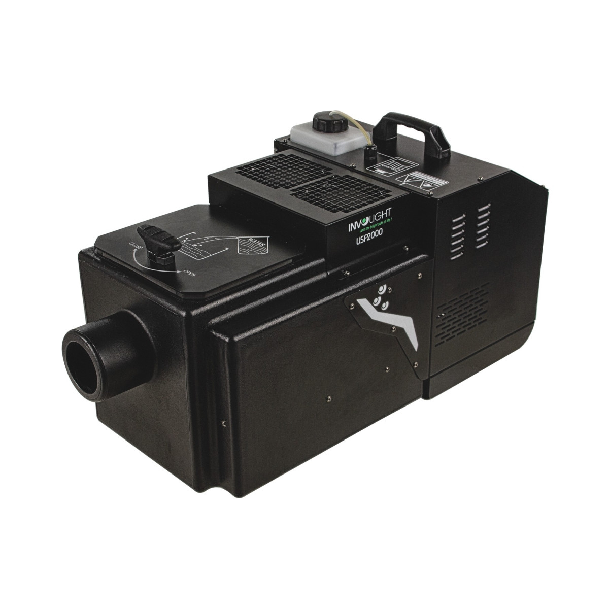Генератор оборудован двумя раздельными резервуарами: объём бака для воды составляет 8 литров, а для дым-жидкости (например, Look Solutions Unique Fluid или INVOLIGHT UMBRA) — 1,2 литра. Это обеспечивает длительную непрерывную работу без дозаправки. Расход жидкости составляет 19 мл/мин при 100% выбросе и 2 мл/мин при 1%, что позволяет экономично расходовать реагенты. Важно отметить, что устройство работает только со специальными жидкостями для низового тумана на водной основе, которые создают дым высокой плотности с медленным рассеиванием в воздухе. Запрещено использовать стандартные дым-жидкости, так как они не обеспечат нужный эффект оседания и могут повредить ультразвуковой излучатель.