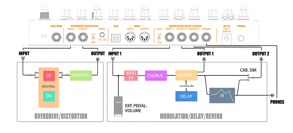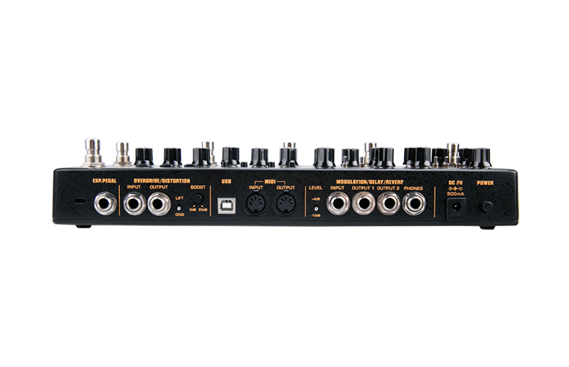 16 типов эффектов разделены на 4 модуля: DELAY, MOD, DIST и DRIVE.