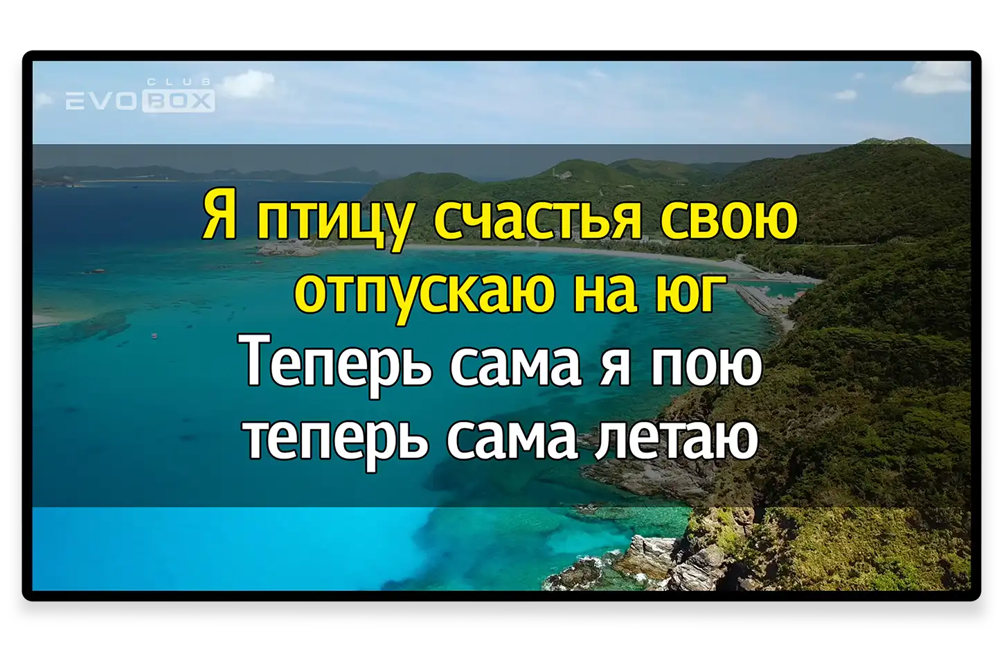 Для создания неповторимой атмосферы в EVOBOX Club специально подобраны видеофоны и слайд-шоу в формате 4K UHD. А четкие титры в 4 строки обеспечат максимальный комфорт при исполнении любимых композиций.
