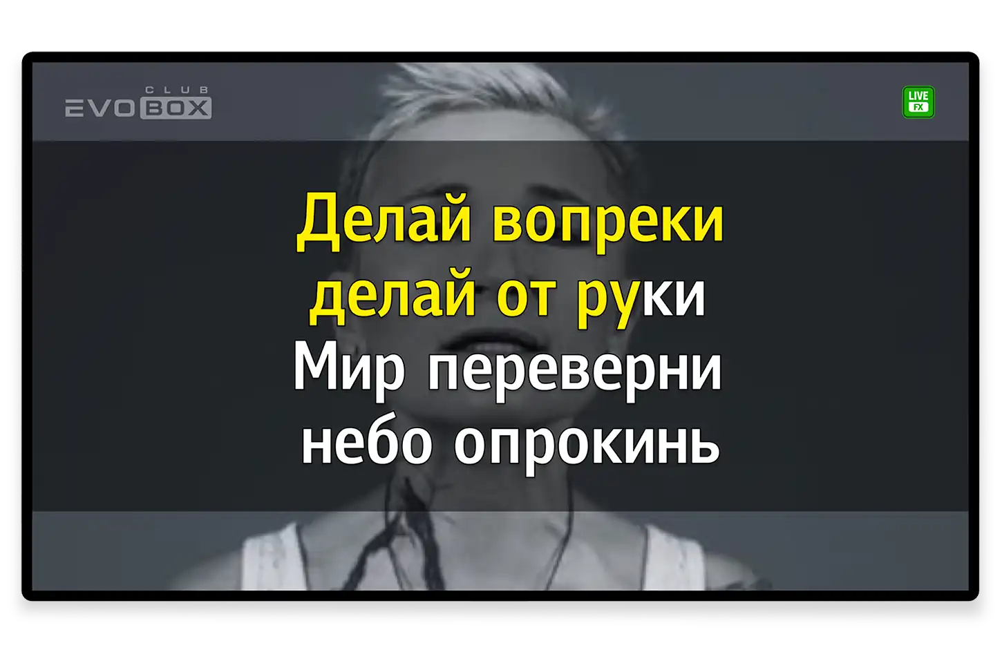 Караоке-система Evobox Club — профессиональная караоке-система для клубов и караоке-комнат. Яркие титры в 4 строки, видеофоны и слайд-шоу в формате 4K UHD. Управление с планшета, оригинальные видеоклипы, фоновая музыка. Уникальный эффект LiveFX для ощущения живого концерта.