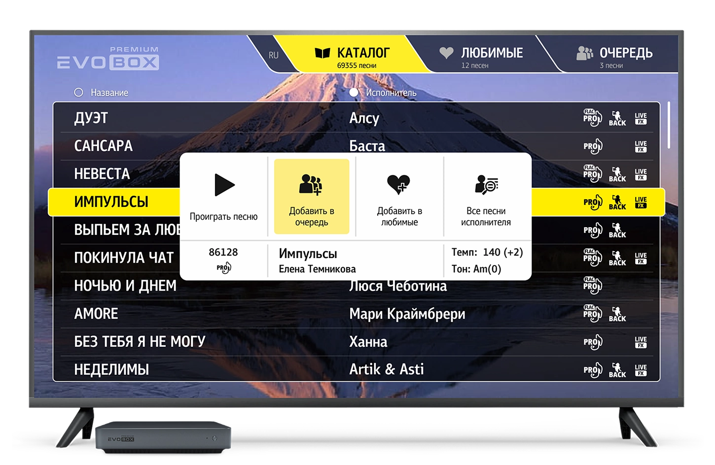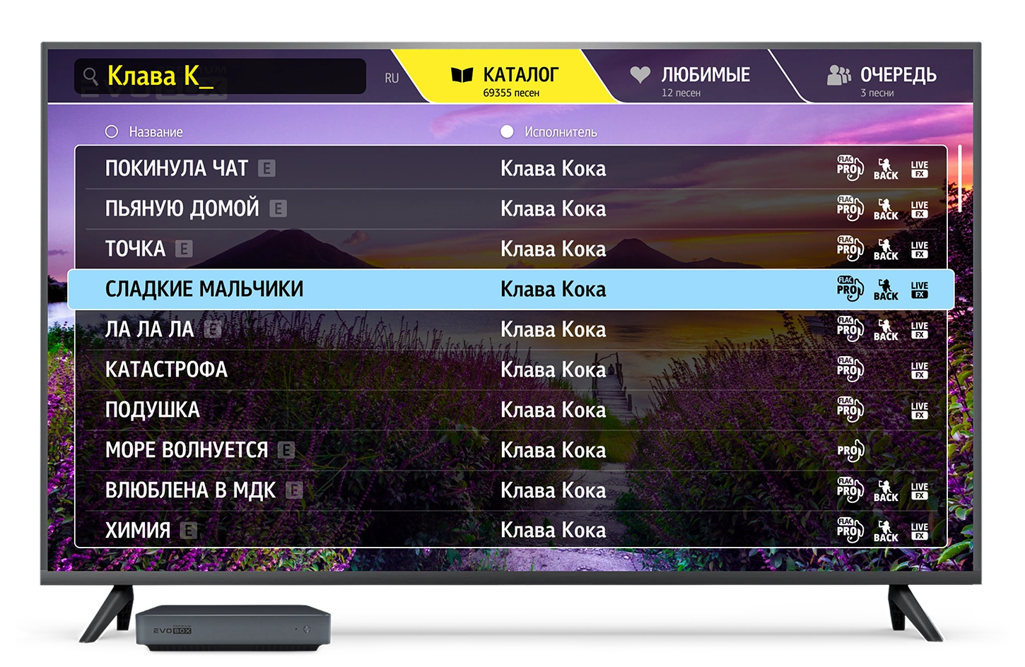 Полный караоке-каталог Studio Evolution содержит более 80 000 композиций. Используя интеллектуальный поиск в EVOBOX Premium, находите любимые песни по словам из текста, исполнителю или названию.