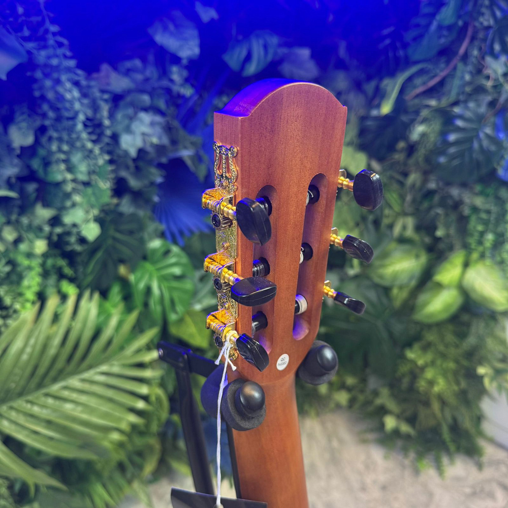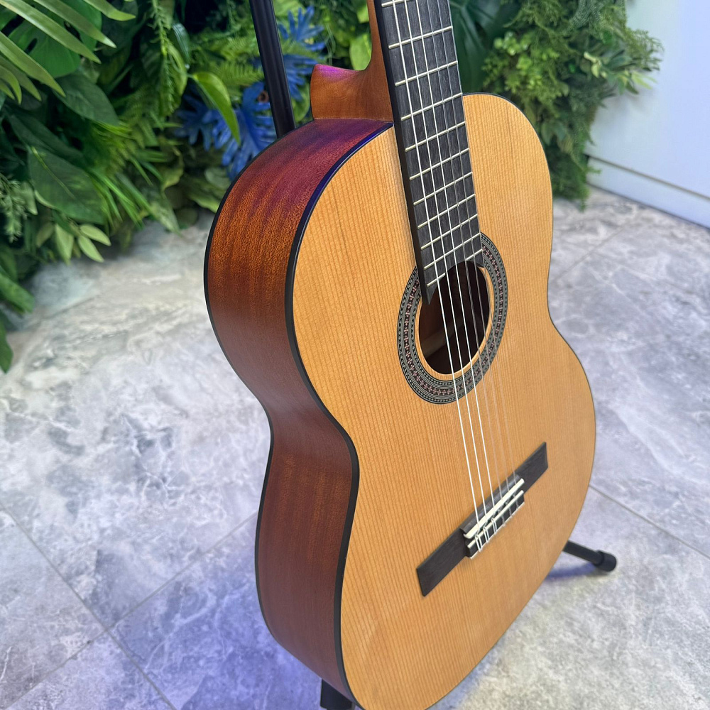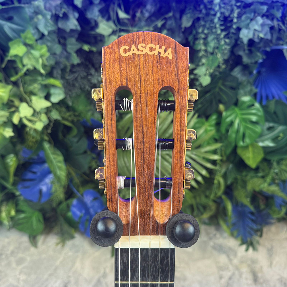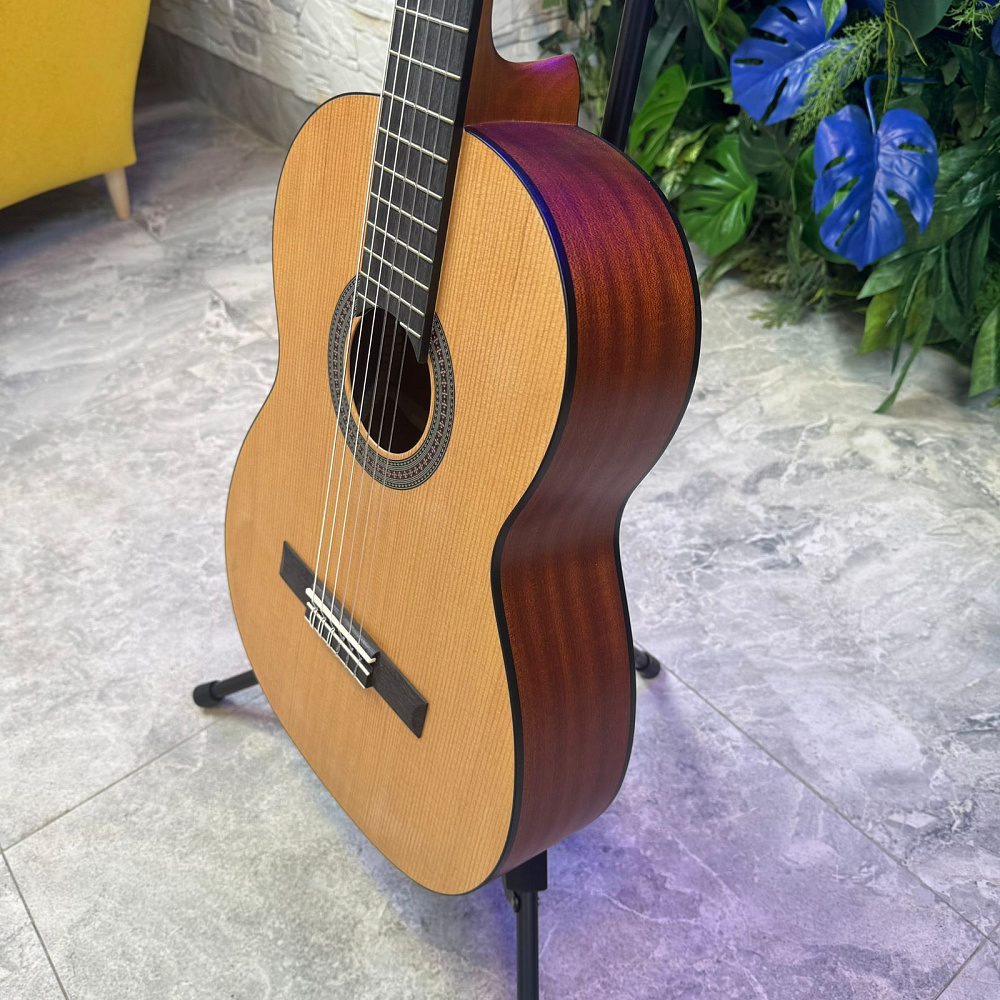 Cascha CGC 200 4/4 — это классическая гитара с мензурой 65 сантиметров (39 дюймов). Отборная древесина придает этой модели насыщенный, теплый звук с длительным сустейном. Верхняя дека гитары изготовлена из ели, нижняя дека и обечайка из высококачественного красного дерева, как и гриф. Накладка грифа и бридж изготовлены из прочного амаранта (Purple Heart).