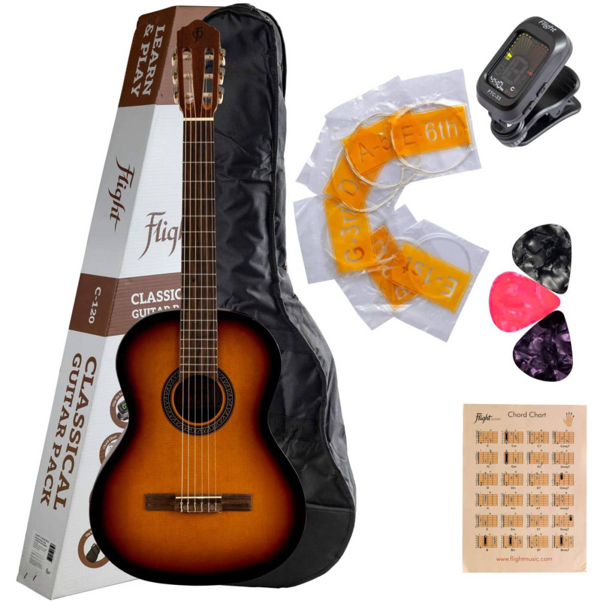 FLIGHT C-120 SB PACK – это комплект с классической гитарой цвета санберст и набором необходимых аксессуаров.