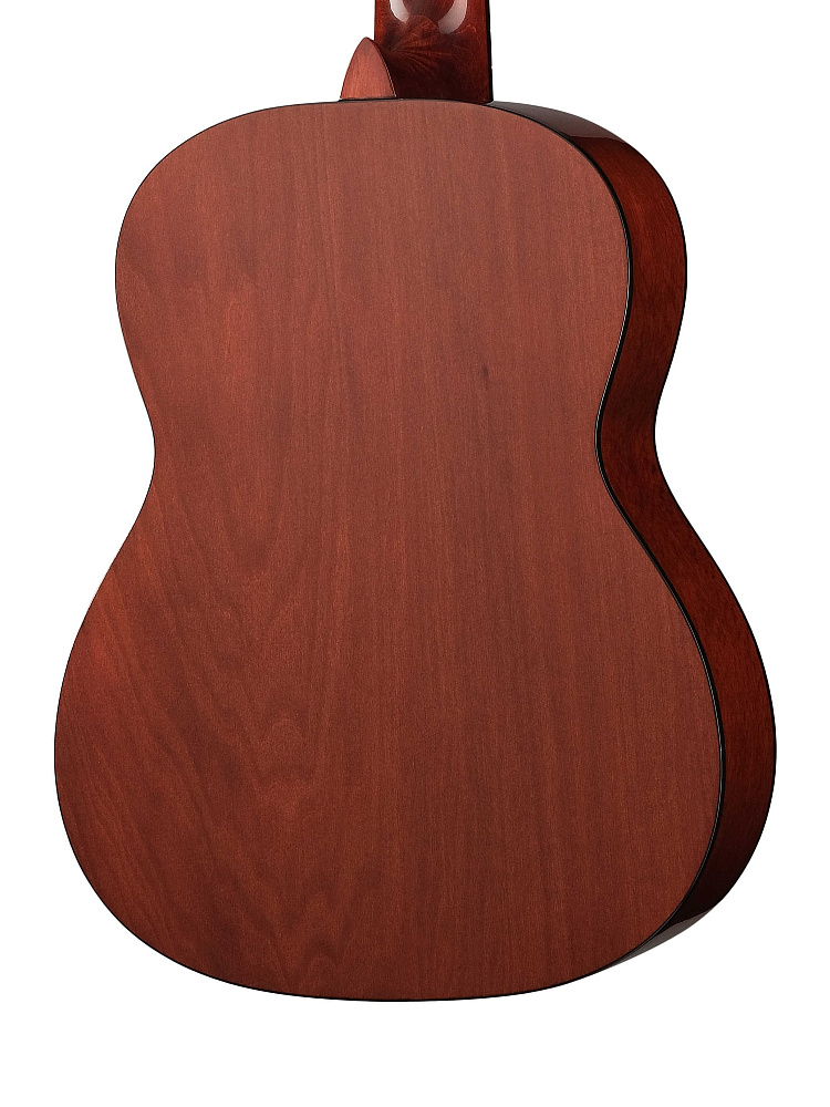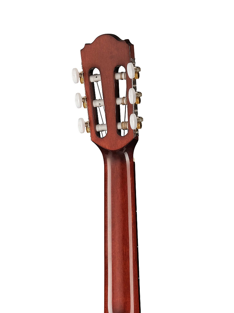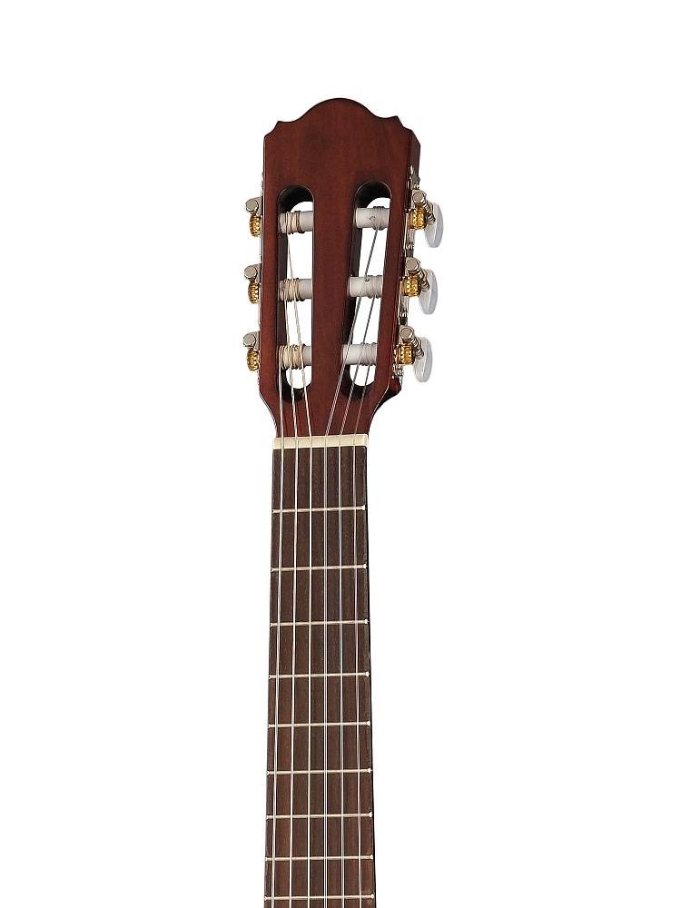 Классическая гитара 1/2. Верхняя дека - ламинат ели, нижняя дека - ламинат липы, Гриф - клен, накладка грифа - твердые породы дерева черного цвета, розетка - переводная картинка. Румыния